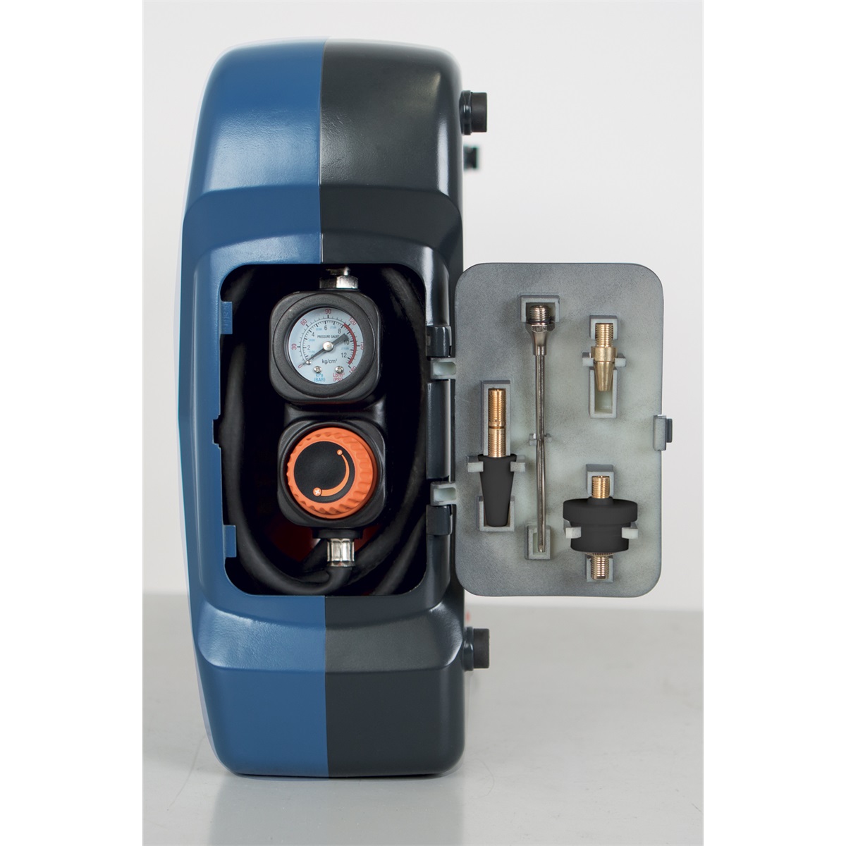 - Ano, veškeré příslušenství je uloženo uvnitř. Patří sem 3m tlaková hadice, která funguje jako plnicí pistole s integrovaným manometrem a regulátorem tlaku, samostatná ofukovací pistole a sada 9 různých koncovek (adaptérů).