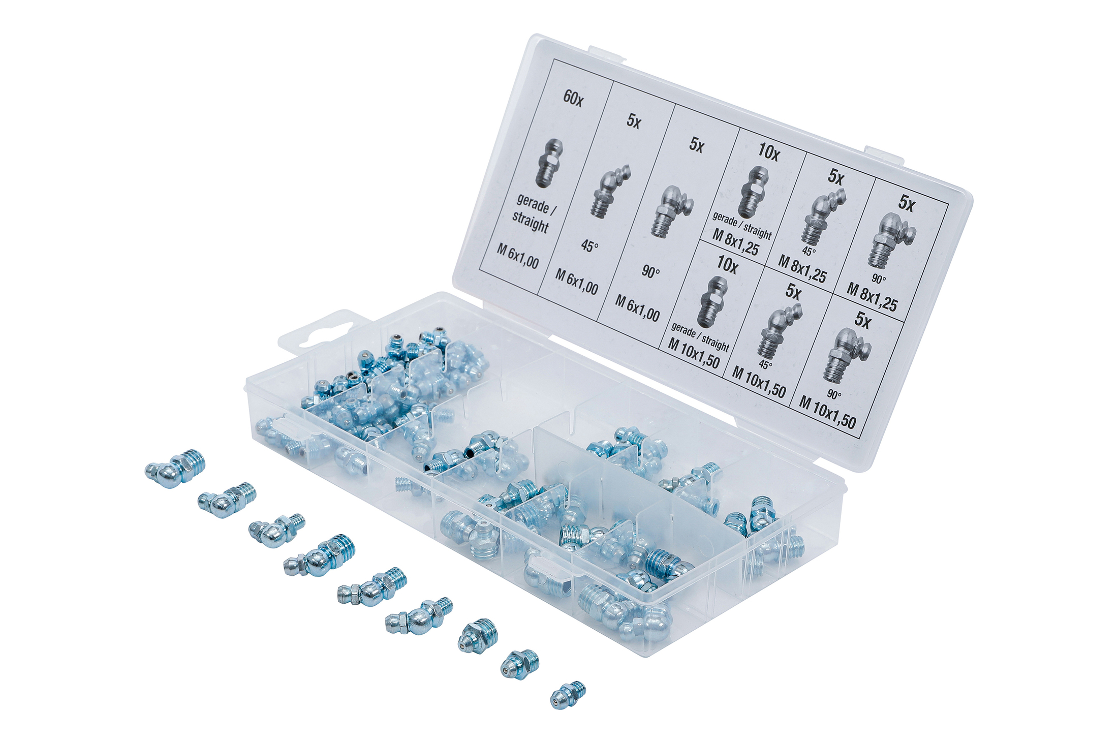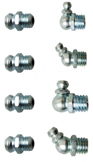 Sada chromovaných maznic „niplů“ 110ks Sada chromovaných maznic Chromované. Rozměry: M6x1 – rovné, 45°, 90° M8x1,25 – rovné, 45°, 90° M10x1,5 – rovné, 45°, 90°.