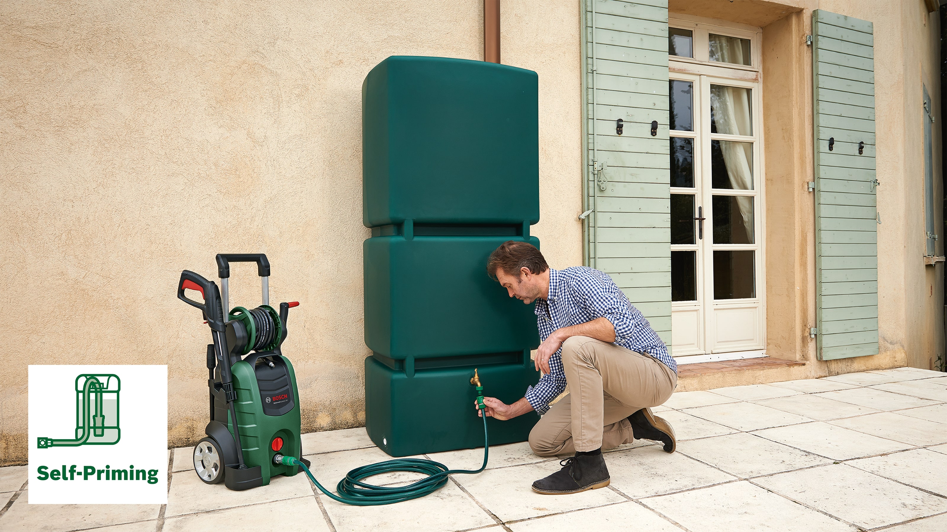 | Větší flexibilitaVysokotlaký čistič Bosch je vybaven schopností samonasávání z externího vodního zdroje, jako je nádrž na dešťovou vodu. To přináší větší flexibilitu a možnosti pohybu při čištění. |