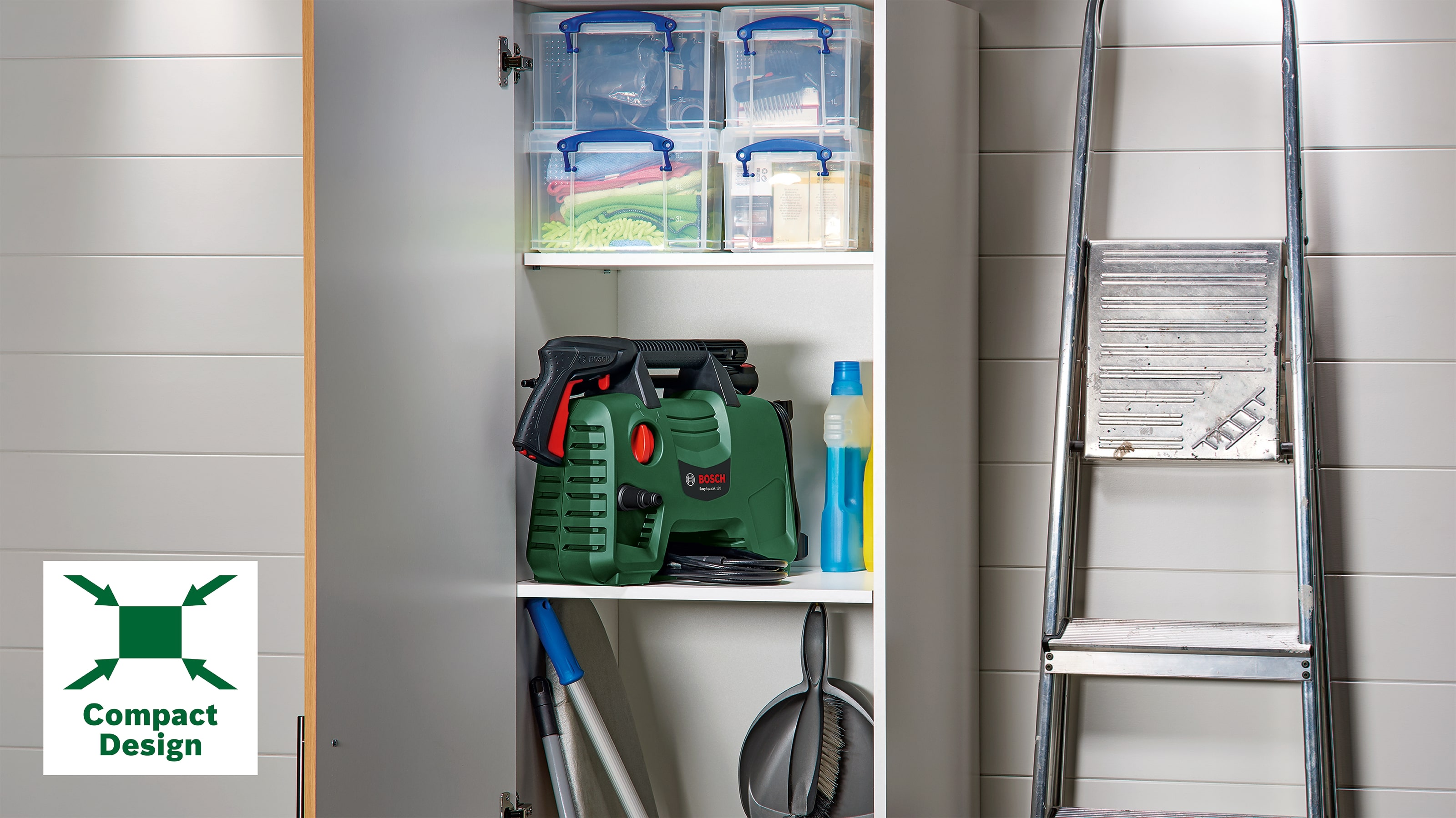 Kompaktní konstrukce, snadné ukládáníLehká konstrukce s uložením příslušenství usnadňuje přemisťování mezi různými oblastmi čištění. Vysokotlakou hadici, pistoli a trysku na čisticí prostředky lze zavěsit přímo na přístroj, což je perfektní pro ukládání v menších domech. |