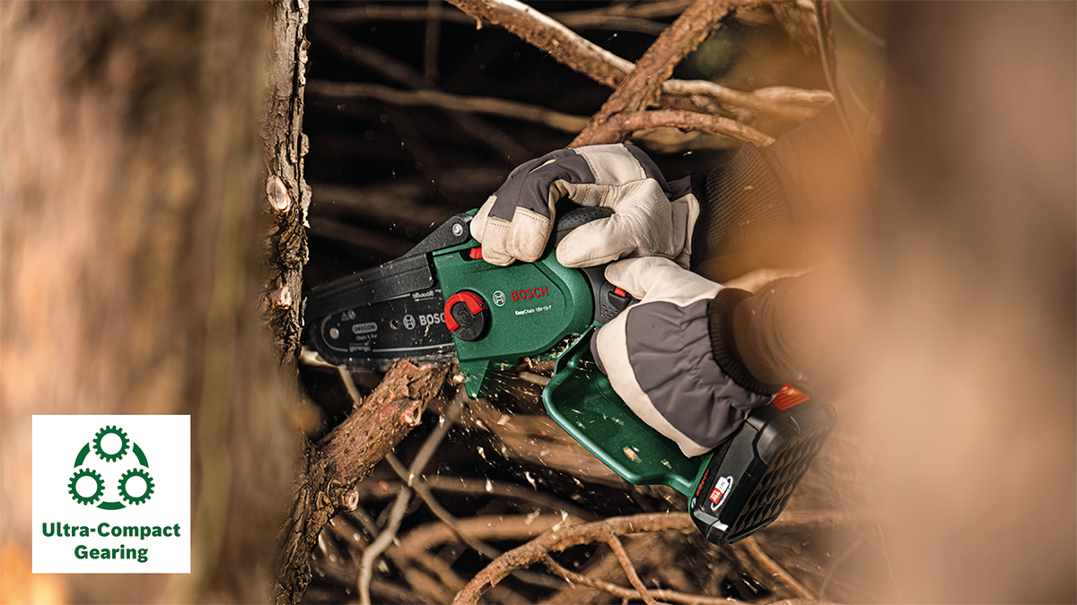 | Ultra kompaktní ozubeníPatentovaný ultra kompaktní převodový systém Bosch zajišťuje vyšší výkon v malém prostoru a zaručuje špičkovou ergonomii a možnost přístupu do těsných prostor pro snažší prořezávání. |