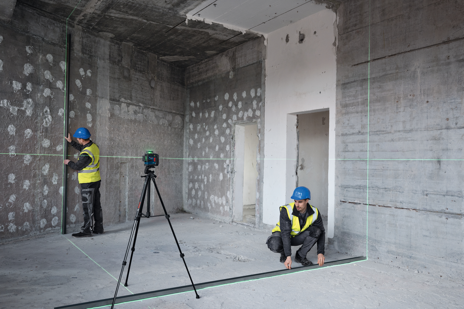 - Tři 360° linie (1 horizontální, 2 vertikální) umožňují současné vyrovnávání v celé místnosti. Nemusíte laserem otáčet, čáry pokryjí všechny stěny, podlahu i strop. Zelená barva navíc zajišťuje vynikající viditelnost paprsků, zejména v interiérech.
