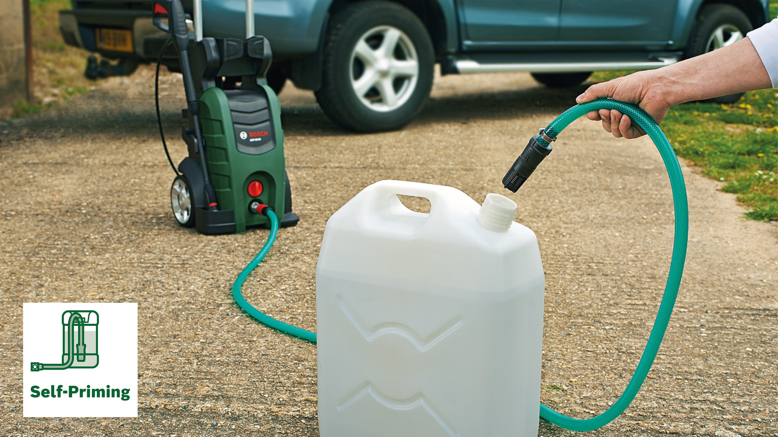 | Větší flexibilitaVysokotlaký čistič Bosch je vybaven schopností samonasávání z externího vodního zdroje, jako je nádrž na dešťovou vodu. To přináší větší flexibilitu a možnosti pohybu při čištění. |