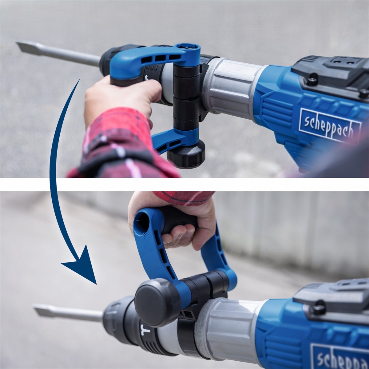 Přídavná rukojeť je otočná v plném rozsahu 360 stupňů, což umožňuje pevný úchop v jakémkoli úhlu bourání.