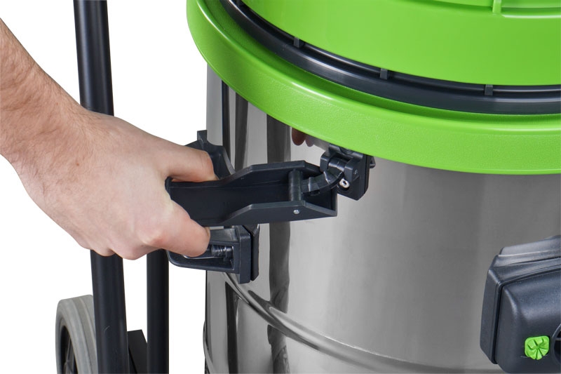 Třímotorový vysavač určený pro vysávání kapalin, třísek a dalších pevných částic s nerezovou nádobou a naklápěcím mechanismem. Vestavěná zásuvka pro připojení elektrického nářadí bez automatického spuštění při zapnutí nářadí.