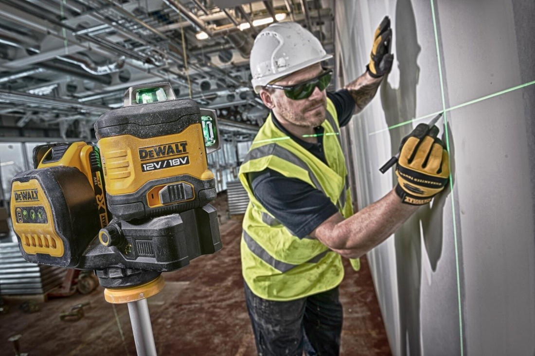 - VYNIKAJÍCÍ VIDITELNOST: představuje zelený paprsek, který je až čtyřikrát jasnější než červené lasery pro lepší viditelnost. Paprsky jsou viditelné až do vzdálenosti 35 m při práci v interiéru nebo pomocí volitelného detektoru DE0892G prodlouží dosah na 50 m interně nebo externě.
