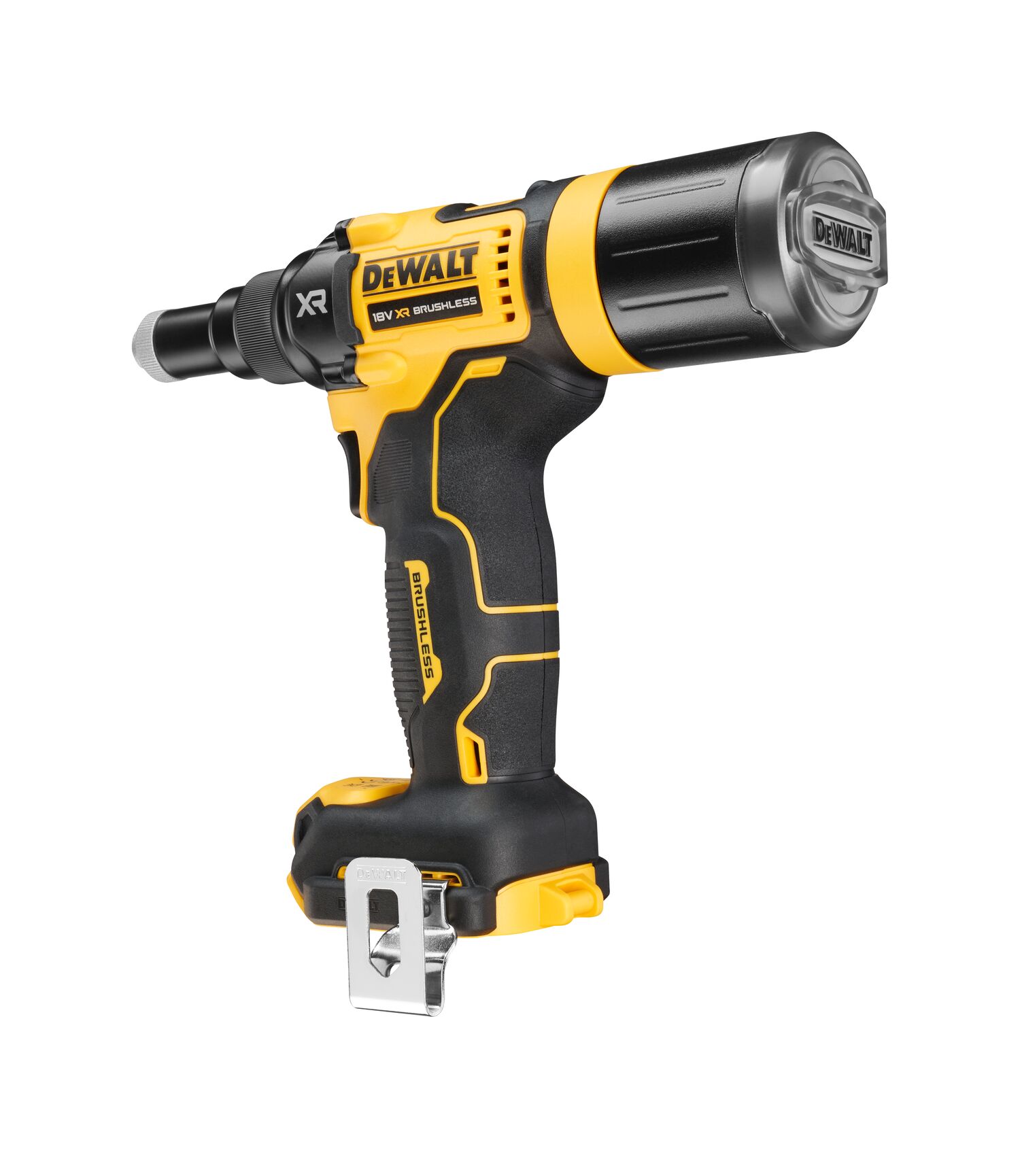Montujte trhací nýty z hliníku a běžní i nerezové oceli o průměru do 4,8 mm pomocí akumulátorového nýtovacího nářadí vybaveného bezuhlíkovým motorem 18V XR®. Bezuhlíkový motor poskytuje tažnou sílu o velikosti až 10 kN a umožňuje zpracování až 800 nýtů z nerezové oceli o průměru 4,8 mm na jedno nabití. Další vlastnosti, které přispívají k dosahování maximální produktivity na pracovišti, zahrnují výměnu koncového dílu bez použití jiného nářadí a integrovaný úložný prostor pro ukládání koncových dílů.