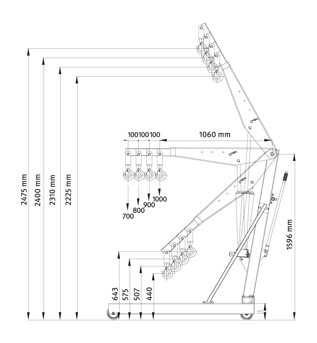 Se zvětšujícím se vyložením ramene klesá nosnost: 1t (1060mm) / 0.9t (1160mm) / 0.8t (1260mm) / 0.7t (1360mm).