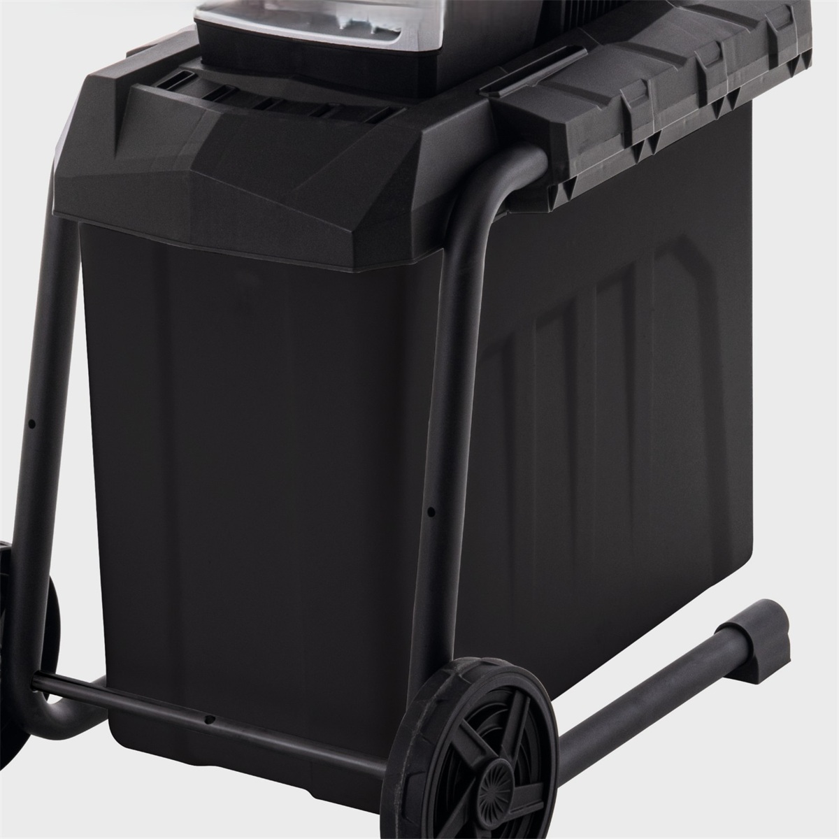 Transparentní 56l box dovoluje sledovat stav naplnění a zajišťuje, že se drtič nespustí bez sběrné nádoby.