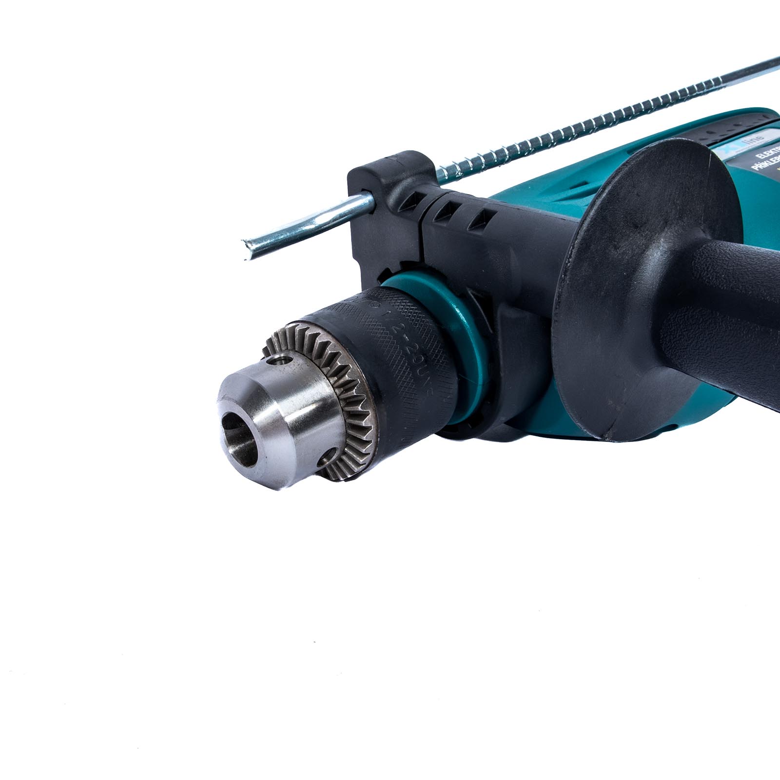 Příklepové vrtačka s kovovým sklíčidlem pro přesné vrtání, umožňuje snadné vrtání do všech materiálů, díky příklepu i do stavebních materiálů. Vrtačka je dobře ovladatelná díky velkým vypínačům, přepínačí směru chodu a plynulé regulaci otáček – vše na rukojeti. Předností pro vrtačku je výkonný motor pro vrtání/vrtání s příklepem, plynulá regulace otáček podle druhu materiálu, nízká hmotnost a kompaktní design a vysoký točivý moment Součást balení je pár uhlíků, hloubkový doraz, přídavná rukojeť, klička ke sklíčidlu.