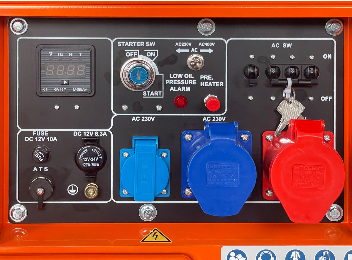 Široká výbava zásuvek včetně 32A průmyslové pro odběr plného výkonu na 230V a 12V DC pro nabíjení baterií.
