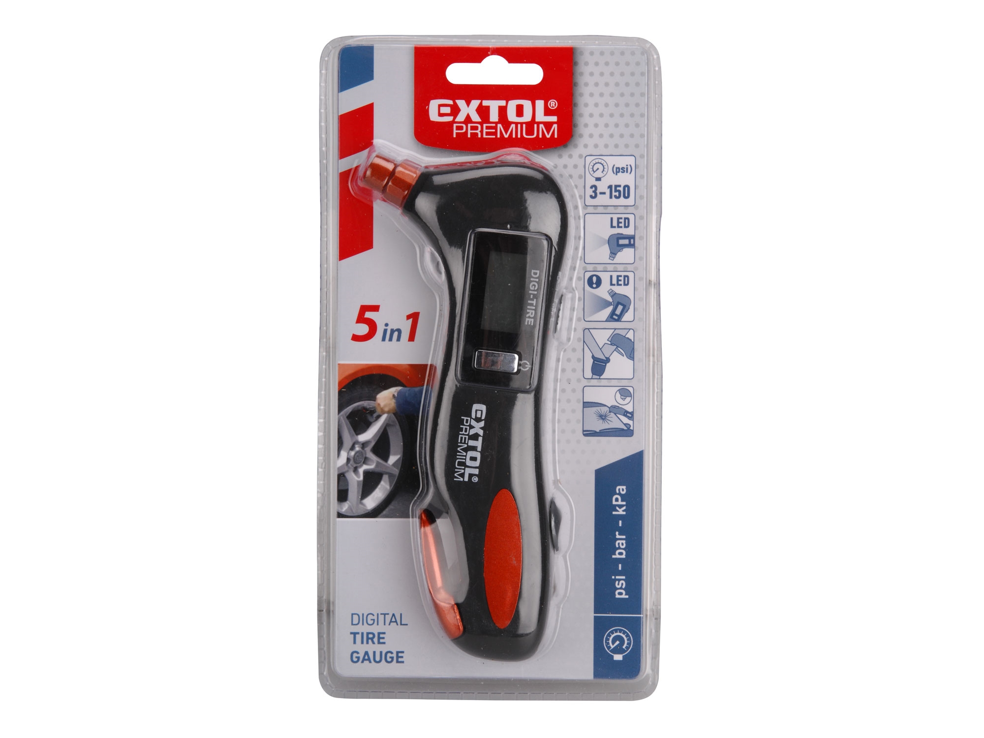 | Doplňující parametr | 5 funkcí: , pneuměřič 3-150PSI (jednotky psi, bar, kPa), LED světlo bílé, LED světlo výstražné červené, nůž na bezpečnostní pásy, kladívko na sklo, baterie 2×1,5V typ AAA (nejsou součástí balení), LCD displej |