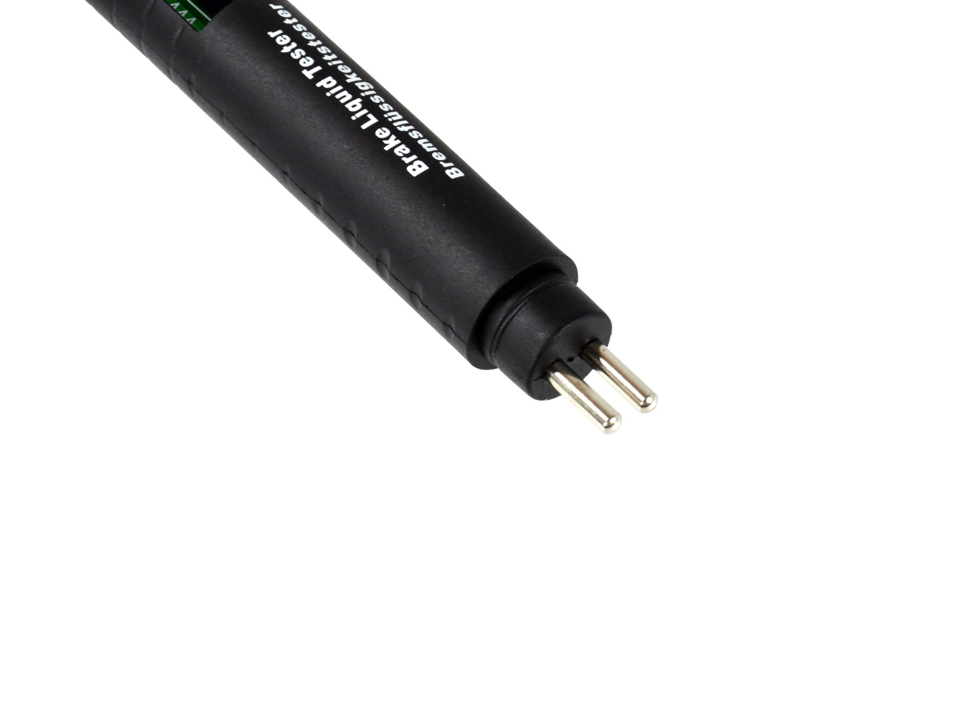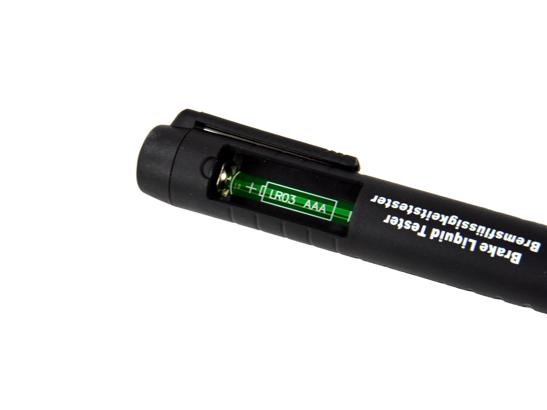 Tester brzdové kapaliny DOT3, DOT4, DOT5.1, s LED identifikátory, napájení baterií AAA – GEKO G02731. Speciální tester je určena pro rychlé a snadné zjištění stavu náplně brzdového systému změřením procentuálního obsahu vody. Kvalitu tekutiny ukazují barevné LED diody na přístroji.Základním parametrem určujícím kvalitu brzdové kapaliny je bod varu, který zase úzce souvisí s obsahem vody.Obsah vody přibližně 3,5 % snižuje teplotu varu kapaliny přibližně o 100 °C.Brzdová kapalina má silné hygroskopické vlastnosti, a proto je periodická kontrola kvality tak důležitá.Brzdová kapalina by neměla obsahovat více než 1,5 % vody, podmíněně je povolen obsah vody až asi 3 %, nad tuto hodnotu musí být brzdová kapalina zcela vyměněna.Značení: • zelená dioda – baterie je v pořádku, obsah vody <1 %• žlutá dioda – obsah vody od 1 % do 2 %• dvě žluté diody – obsah vody od 2 % do 3 %• červená dioda – obsah vody cca 3 %• dvě červené diody – obsah vody nad 3 %Obsah balení:• Tester brzdové kapaliny • Baterie AAA