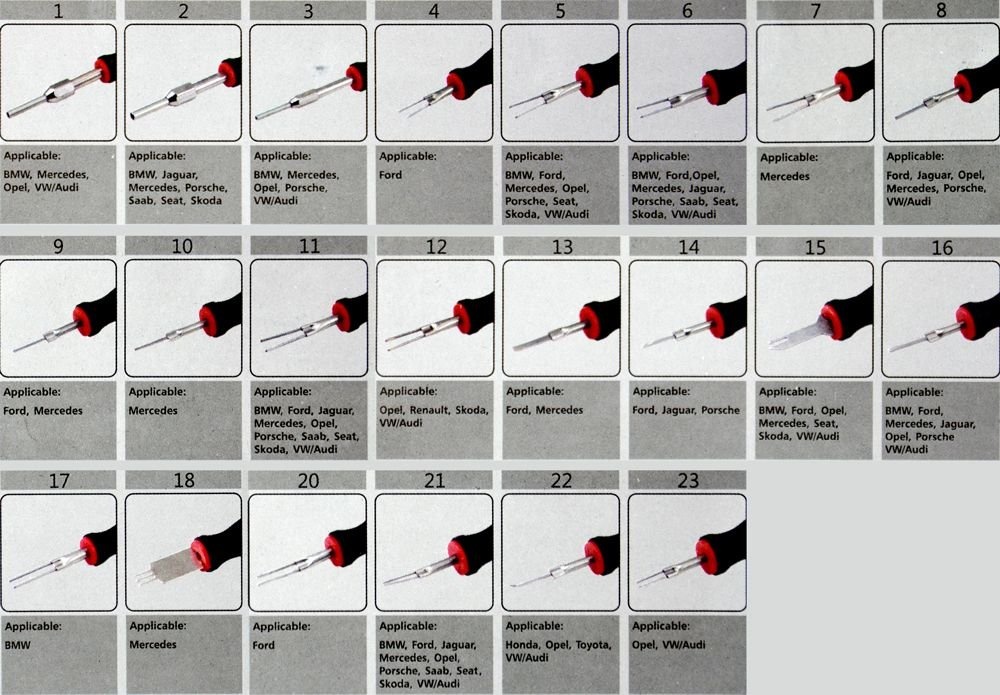 Sada vypichováků na demontáž konektorů v elektroinstalaci vozidla, 23 dílů v plastovém kufru – Genborx VT13009 Souprava vypichováků s „vidličkami“ různých tvarů je použitelná na všechny obvyklé značky automobilů. Pro snadné rozpojování konektorů pokrývá většinu…