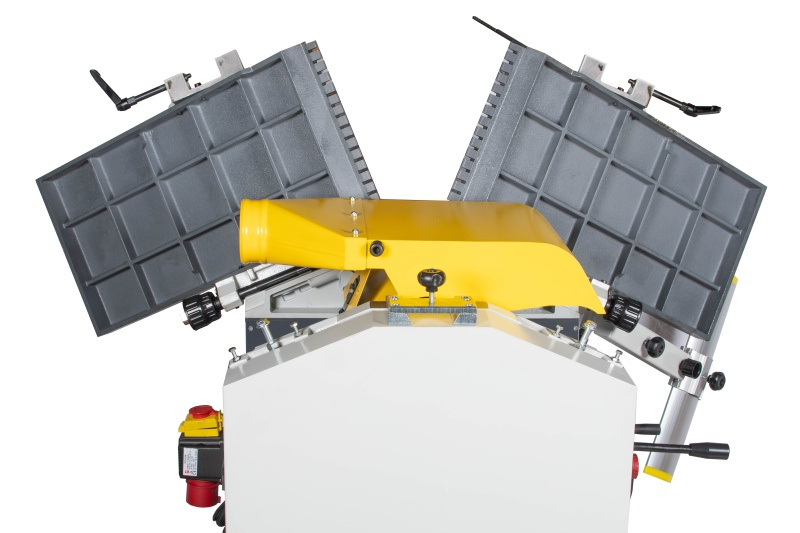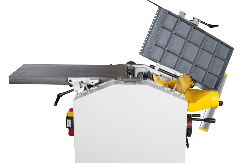Přestavba je velmi rychlá díky systému odklápěcích stolů. Stačí uvolnit aretaci, stoly odklopit a překlopit odsávací hrdlo. Při hoblování je navíc automaticky vypnutý posuv protahu, což zvyšuje bezpečnost.