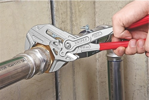 Klešťový stavitelný klíč, instalatérský, s tlačítkem, 250 mm – KNIPEX 86 03 250. Nastavitelný klíč s 29 pozicemi nahradí metrické i imperiální klíče až do rozměru 52 mm (2″). Díky hladkým čelistem a nulové vůli se s ním může…
