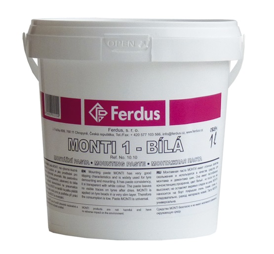 Montážní pasta MONTI 1, objem 1000 ml – Ferdus 10. 10 Montážní pasta MONTI 1 má výborné kluzné vlastnosti a používá se jako prostředek pro montáž a demontáž pneumatik. Má pastovitou konzistenci, je transparentní, a po uschnutí nezanechává na pneumatice viditelné stopy. MONTI se nanáší…