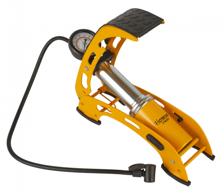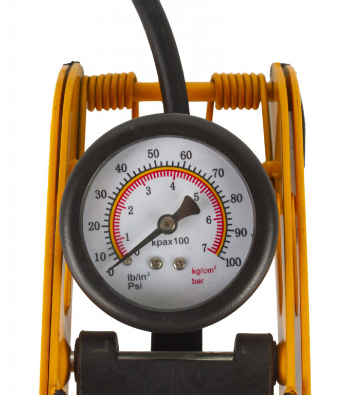Kompaktní a bytelná pumpa pro huštění pneumatik na autě, motorce či jízdním kole, pro nafukování bazénů, matrací, balónů apod. Díky pedálu není třeba se při práci ohýbat, hadice je vybavena standardní koncovkou s pojistkou na autoventilek. Tlak lze sledovat na přehledném manometru.