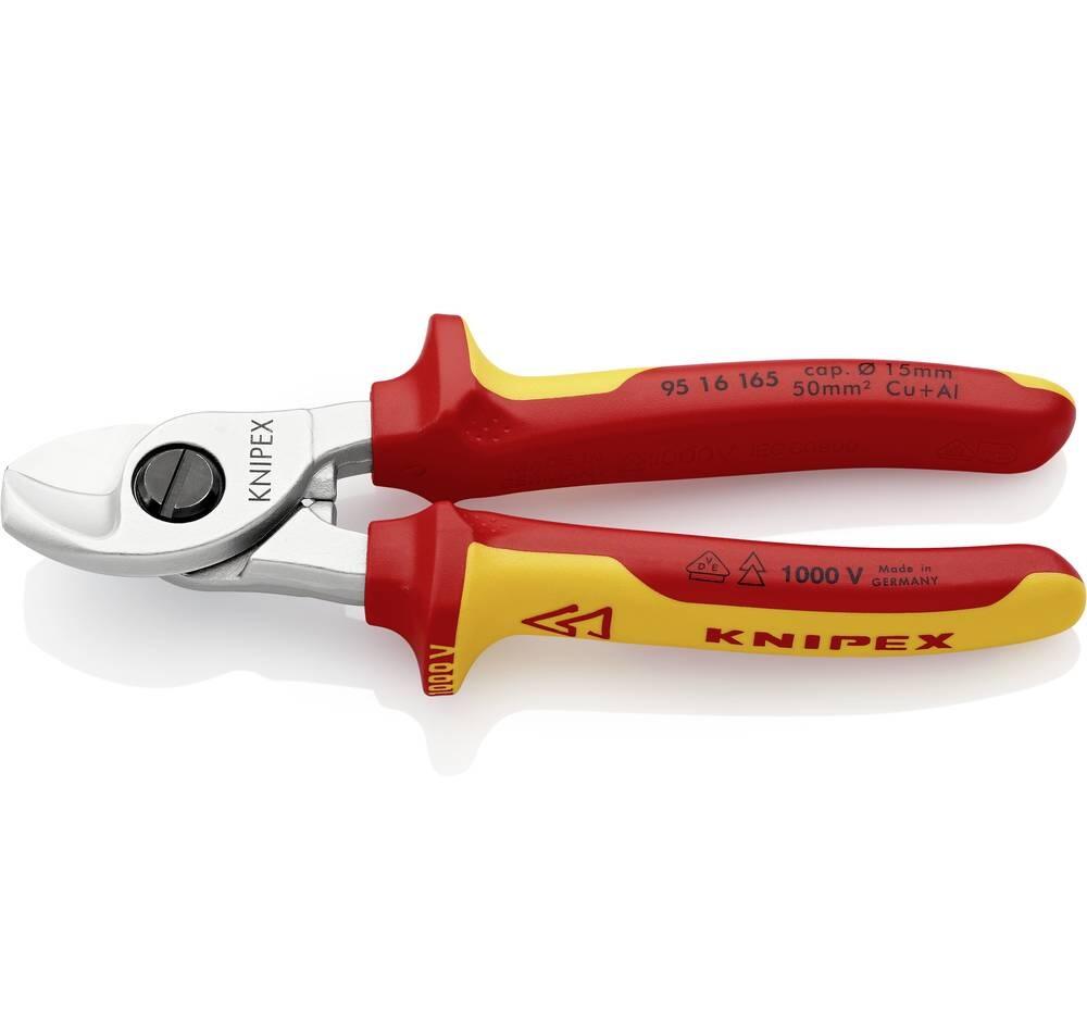Izolované nůžky na kabely, elektrikářské VDE 1000 V, pro vodiče do průměru 15 mm – Knipex 95 16 165Vysoce kvalitní nůžky na kabely navržené pro hladké a čisté stříhání bez mačkání vodičů. Umožňují snadné použití jednou rukou a jsou vybaveny nastavitelným šroubovým kloubem se samozajištěním. Vhodné pro stříhání jemně laněných měděných a hliníkových vícežilových kabelů do průměru 15 mm (50 mm2). Nejsou určeny pro stříhání ocelových drátů nebo tvrzených měděných vodičů.Nůžky mají tvrzené břity s precizním ostřím a jsou vybaveny ochranou proti sevření pro vyšší bezpečnost při práci.