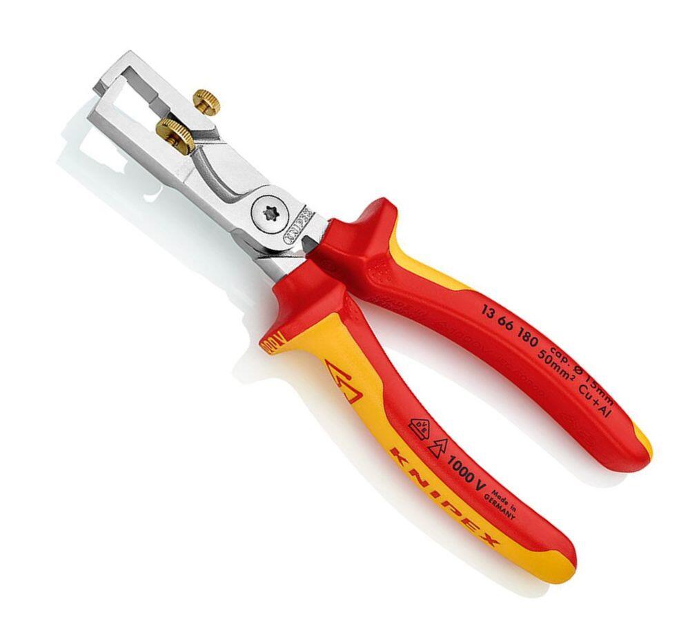 Odizolovací kleště s nůžkami na kabely – dva základní elektroinstalační nástroje v jedněch kleštích.Integrované nůžky na kabely pro čisté stříhání měděných i hliníkových kabelů bez poškození.Břity doplňkově induktivně tvrzené, tvrdost břitů asi 57 HRC.Univerzální nastavení odizolovacích čepelí vroubkovaným šroubem.Štíhlá konstrukce kvůli lepší přístupnosti.Odizolování jedno-/vícežilových či jemně splétaných vodičů s plastovou nebo pryžovou izolací až do průměru 5 mm nebo průřezu 10 mm2.Čepel se stupnicí zajišťuje vizuální orientaci při odizolování vodičů běžných délek (11 a 16 mm).