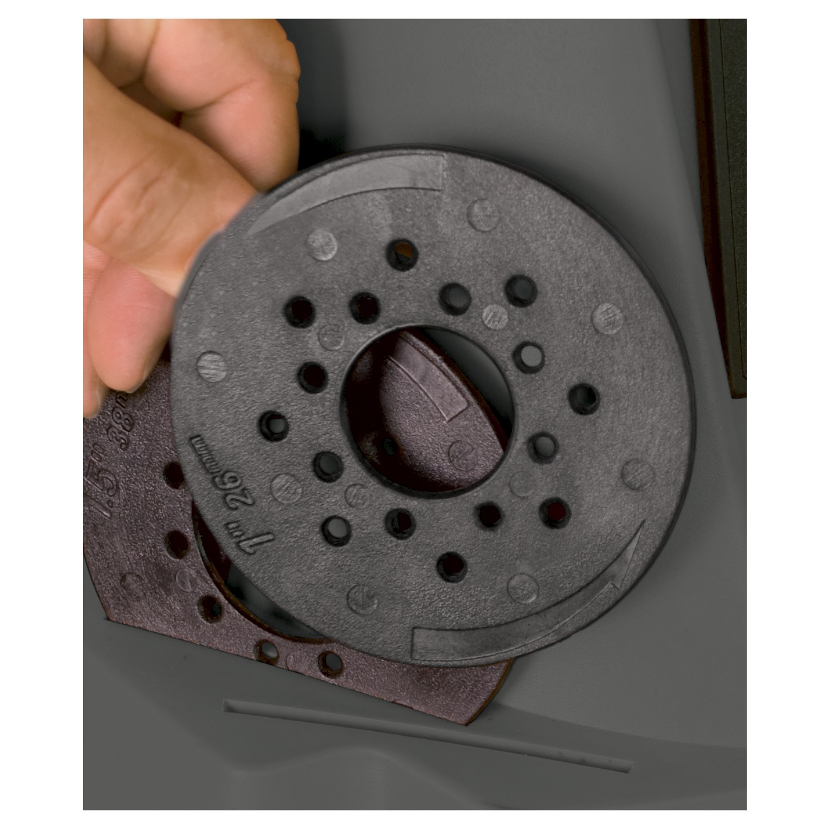 - Bohaté příslušenství: Dodáváno s 5 brusnými válci (pr. 13, 19, 26, 38, 51 mm), brusnými papíry (K80) a odpovídajícími vložkami stolu.