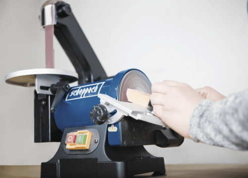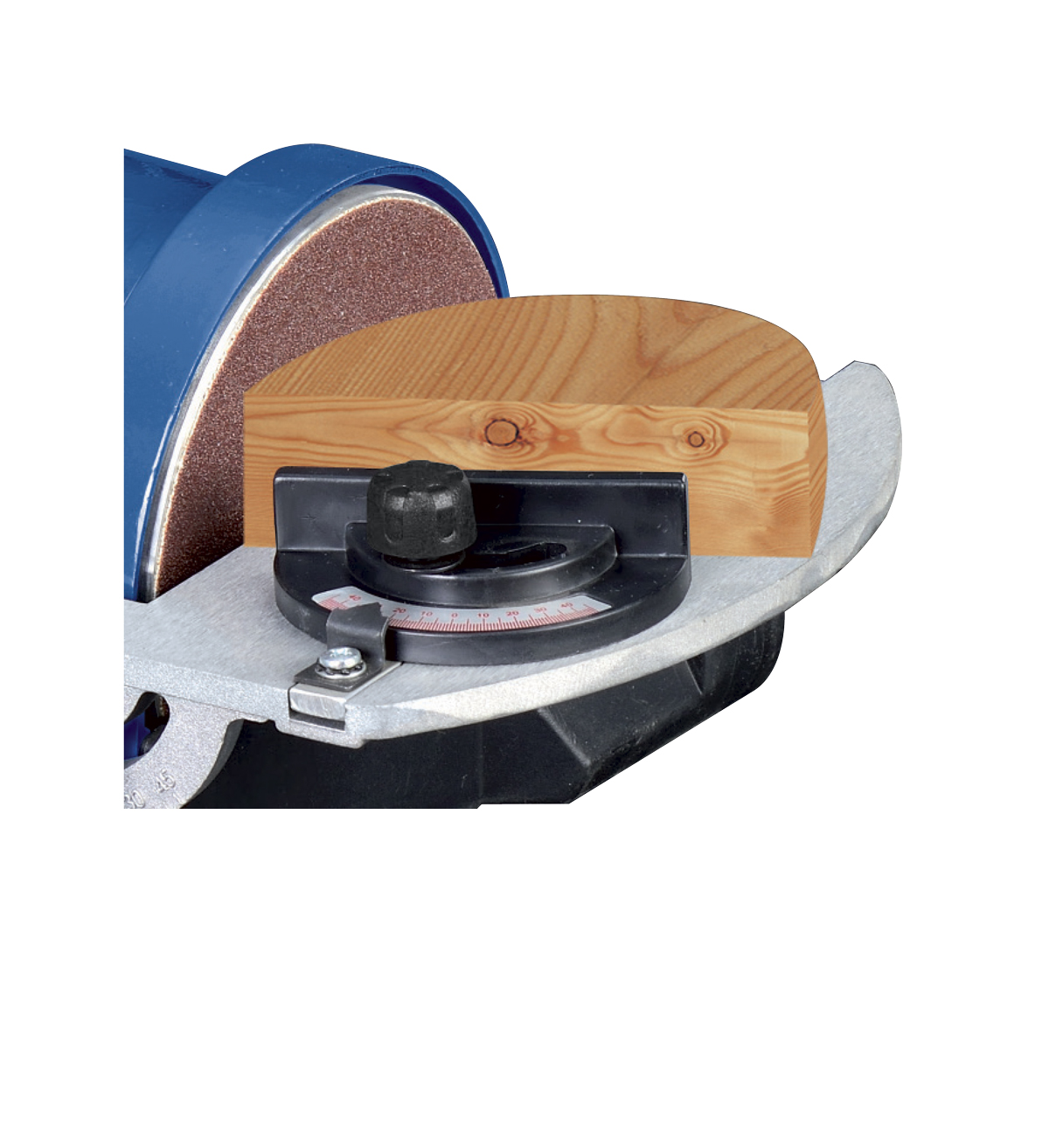 - Naklápěcí pracovní stolky: Stolek u brusného pásu (150×100 mm) i u brusného kotouče (184×98 mm) lze naklápět v rozsahu 0-45° pro úhlové broušení.