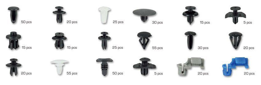 Příchytky čalounění interiéru vozidel Mazda, sada 475 kusů – ASTA A-TC008 Mimořádně rozsáhlá sada spotřebního materiálu, nepostradatelného při opravách interiéru aut. Sada obsahuje různé druhy.