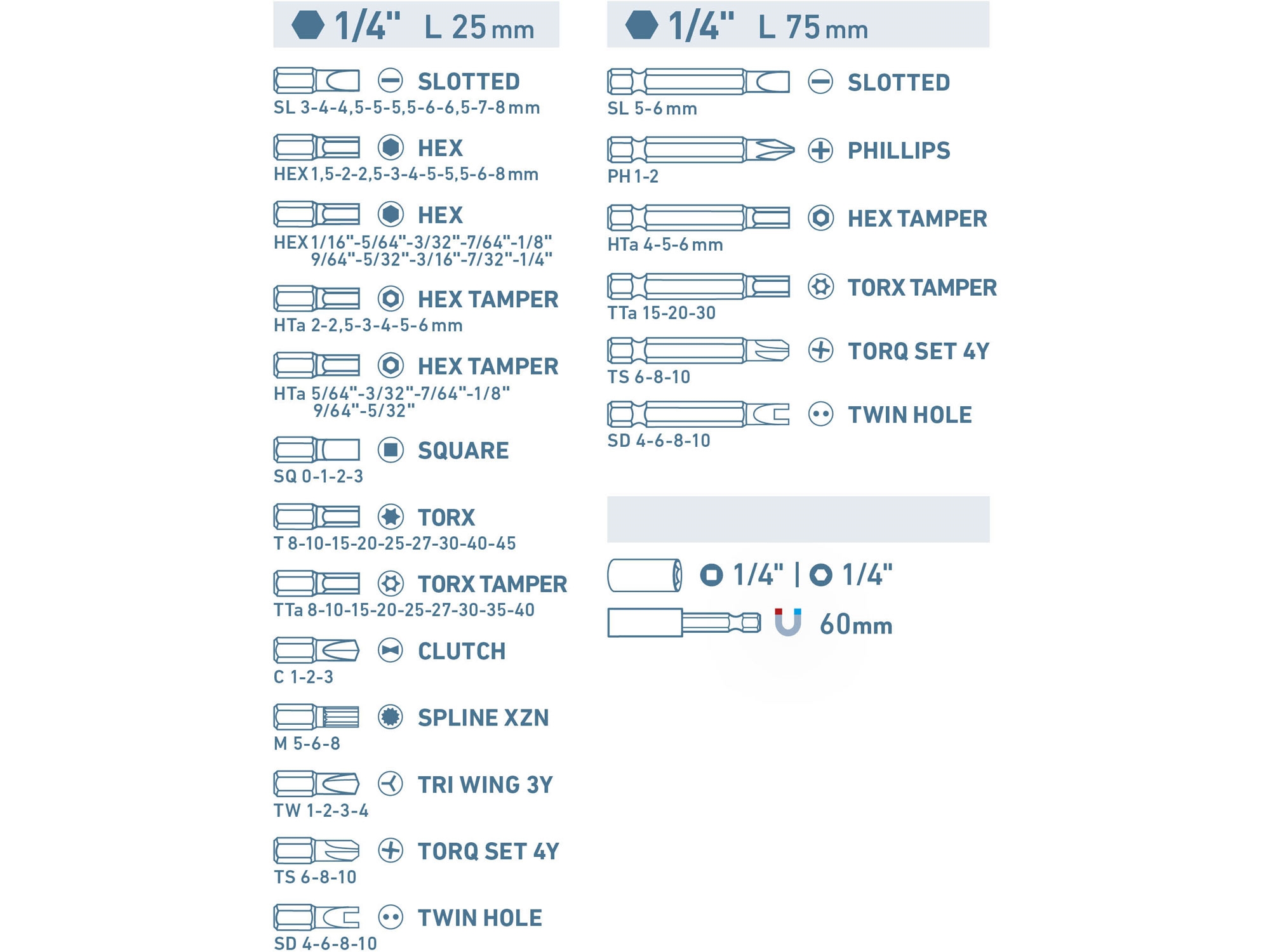 | Doplňující parametr | 79ks 25mm hrotů: (-) 3-4-4,5-5-5,5-6-6,5-7-8mm, HEX 1,5-2-2,5-3-4-5-5,5-6-8mm, HEX-Ta 2-2,5-3-4-5-6, HEX 1/16-5/64-3/32-7/64-1/8-9/64-5/32-3/16-7/32-1/4, HEX-Ta 5/64-3/32-7/64-1/8-9/64-5/32, T 8-10-15-20-25-27-30-40 |