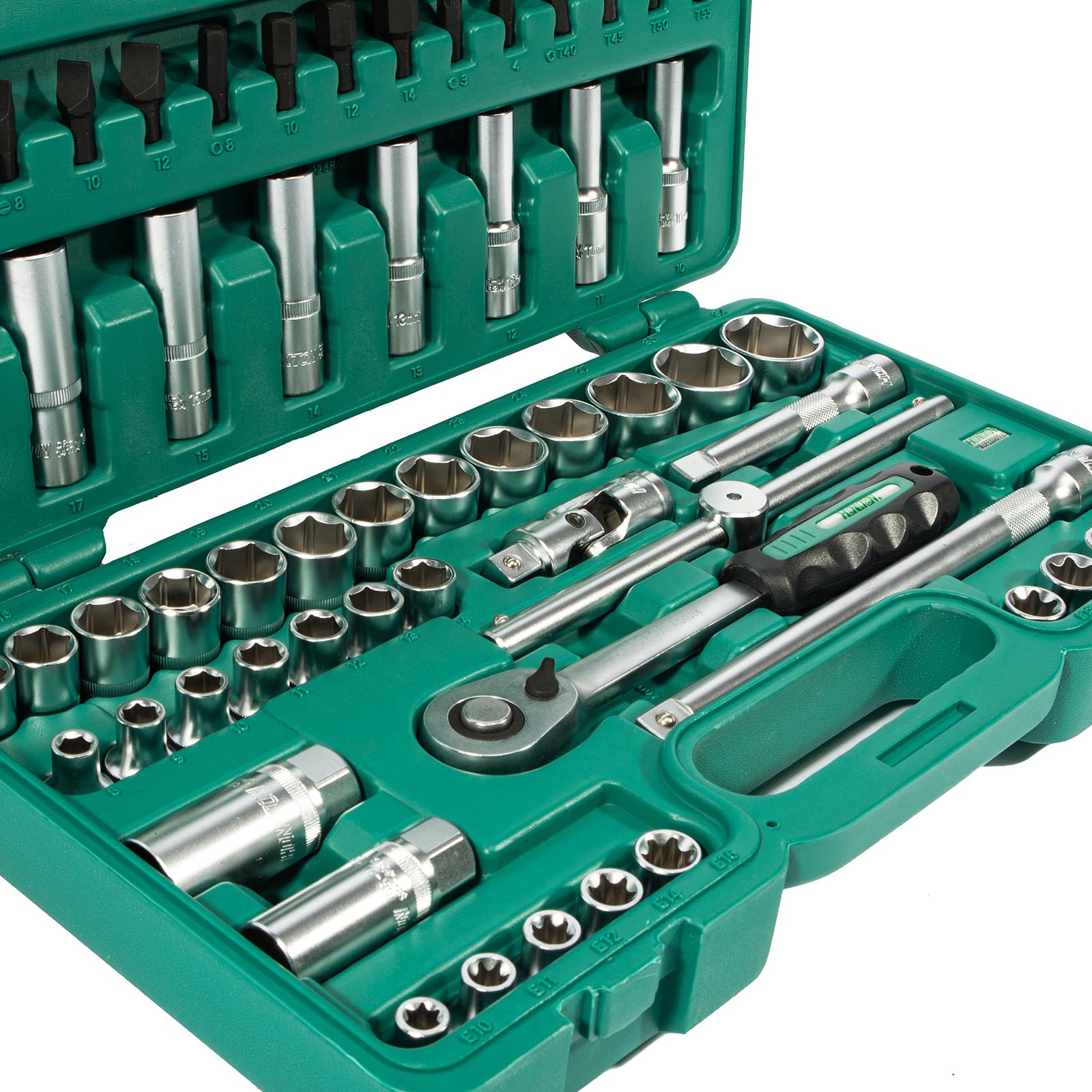 Gola sada Honiton 1/2″ se 64 díly je navržena jako definitivní řešení pro veškeré práce na podvozcích a motorech. Na rozdíl od běžných sad obsahuje tato sestava průmyslové rázové hlavice (17, 19, 21, 24 mm), které jsou připraveny pro práci s rázovým utahovákem při výměně kol. Dalším trumfem je jemná 72zubá ráčna, která díky úhlu záběru pouhých 5° umožňuje práci i tam, kde se s běžnou ráčnou nepohnete. Sada rovněž pokrývá kompletní řadu E-Torx (vnější hvězdička), bez které se u moderních evropských vozů neobejdete. Vše je uloženo v robustním kufru, který chrání nářadí z houževnaté CrV oceli certifikované dle DIN 3124.