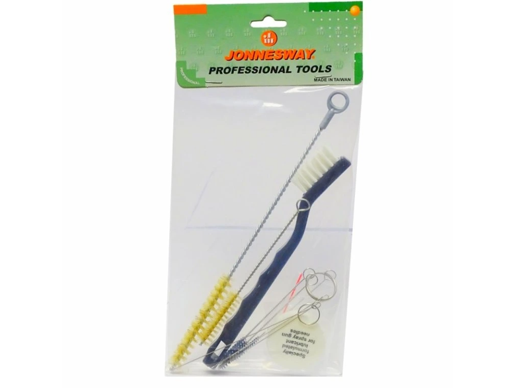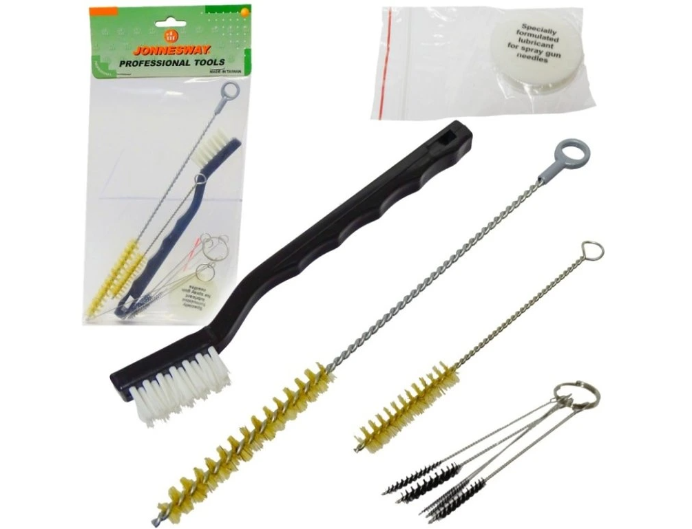 Sada příslušenství na čištění lakovacích pistolí, s mazivem, 12dílná – JONNESWAY AS-0026BSada je speciálně navržena pro čištění pistolí nízkotlakého lakovacího systému HVLP (High Volume, Low Pressure), ale je ideální také k čištění všech ostatních typů finišovacích, retušovacích, sacích a tlakových stříkacích pistolí, airbrush systémů a odrezovacích nástrojů. Sada obsahuje:1× kartáček na čištění těla pistole s plastovou rukojetí1× čistící štětec3× vnitřní kartáče na čištění vnitřků stříkacích pistolí (průměry 10, 15 a 20 mm)6× kovové párátko1× mazivo na stříkací pistole (20 g)