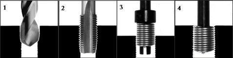 Poškozený závit se odvrtá přiloženým vrtákem, následně se závitníkem vyřeže závit, do kterého se našroubuje pružinková vložka. Vyrážečem se poté odlomí výstupek ve vložce, a výsledkem je nový závit původní velikosti – M14×1,25.
