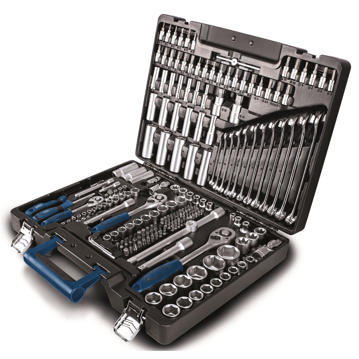 TB 217 – plastový kufr s nářadím, 217 dílů Scheppach TB 217 je velmi praktická a obsáhlá sada nářadí pro většinu prací spojených se šroubováním (217 ks) ukrytá v robustním plastovém kufru. Každý kus nářadí má přesně stanovené místo a bude tak vždy a rychle po ruce. Kufr se dá pomocí přezek pevně uzavřít a můžete ho snadno přenést na místo, kde budete nářadí potřebovat. Nářadí bylo vyvinuto tak, aby kvalitativně výrazně překračovalo běžné standardy v tomto cenovém segmentu. Kvalitní slitina Cr-V a CrMo (chrom-vanadium a chrom molybden)) a hroty bitů ze slitiny oceli S2, jakostní plast na rukojetích i pogumované protiskluzové zóny zaručí, že Vám bude nářadí sloužit po mnoho let. A znalci zase ocení jemný design a chod zubů ráčny, který umožňuje malý zpětný úhel pohybu o 5° a tvar, díky kterému můžete vyvinout větší sílu (ke kontaktu se šroubem dochází v první třetině šestihranu, ne na koncích) bez poničení šroubu. Obsah: Horní patro: 12 x stranový klíč s očkem 30 x bitový nástavec 1/4″ 2 x bitový nástavec 1/2″ 7 x prodloužený ořech 1/4″ 5 x prodloužený ořech 1/2″ 6 x prodloužený ořech 3/8″ 1 x T-vratidlo 1“ Spodní patro: 15 x nástrčný ořech 1/2″ 10 x nástrčný ořech 3/8″ 14 x nástrčný ořech 1/4″ 3 x nástrčný ořech Thorx 1/2″ 6 x nástrčný ořech Thorx 3/8″ 5 x nástrčný ořech Thorx 1/4″ 1 x nástrčný ořech se zajišťovací kuličkou 1/2″ na bity 5/16″ 1 x nástrčný ořech se zajišťovací kuličkou 3/8″ na bity 5/16″ 1 x nástrčný ořech se zajišťovací pružinkou 1/4″ na bity 1/4″ 2 x nástavec na svíčky 1/2″ 1 x nástavec na svíčky 3/8″ 1 x T-vratidlo 1/2″ 1 x prodloužení 25 cm 1/2″ 1 x prodloužení 12 cm 1/2″ 1 x prodloužení 12 cm 38″ 1 x prodloužení 10 cm 1/4″ 1 x prodloužení 5,5 cm 1/4″ 1 x kardanový kloub 1/2″ 1 x kardanový kloub 3/8″ 1 x kardanový kloub 1/4″ 1 x velká ráčna 1/2″ 1 x střední ráčna 3/8″ 1 x malá ráčna 1/4″ 1 x nástrčný šroubovák na bity 1/4″ 1 x nástrčný šroubovák na nástavce 1/4″ 7 x imbusový klíč 30 x bity 5/16“ 44 x bity 1/4″