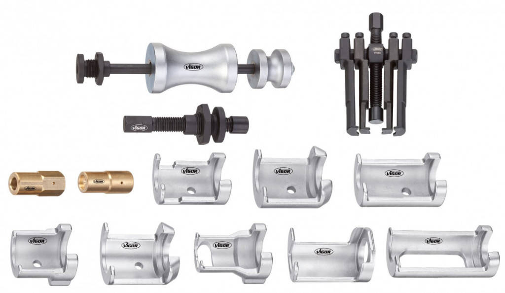 Přípravky – stahováky pro demontáž/stahování ramínek stěračů, univerzální, sada 14 dílů v plastovém kufříku – VIGOR V2523 Všestranné použití pro demontáž ramínek stěračů řady osobních i nákladních automobilů, např. značek Volkswagen, Škoda, Audi, Seat, BMW,…