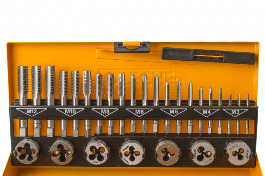 Závitníky a závitová očka pro vyřezání nebo opravu vnitřních i vnějších závitů, sada 32 dílů v plechové kazetě – Hoteche HT640203