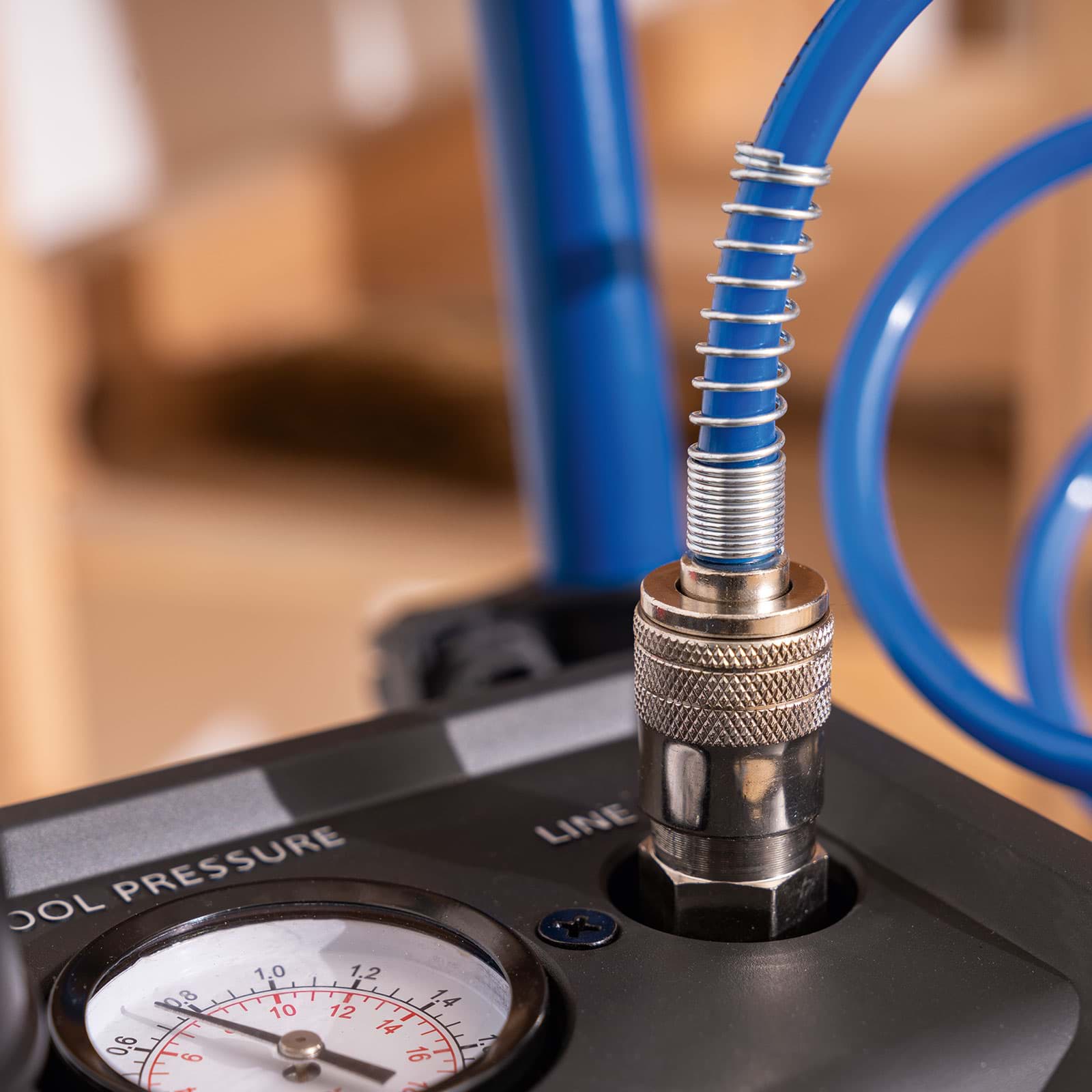 - Dva manometry pro sledování tlaku ve vzdušníku a regulovaného výstupního tlaku.