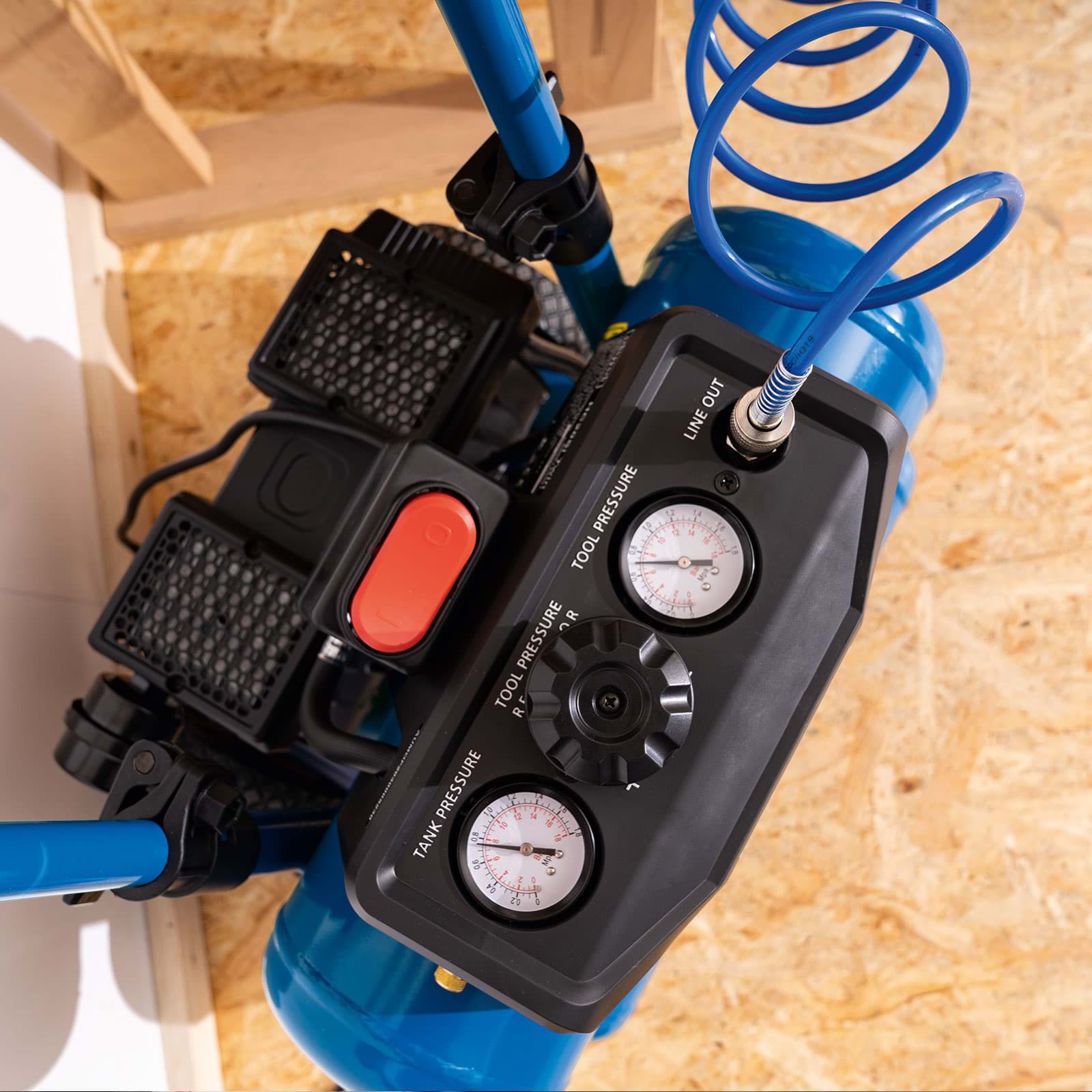 - Dostatečná zásoba vzduchu pro plynulou práci: 20litrový dvojitý vzdušník (2×10 l) zajišťuje stabilní dodávku stlačeného vzduchu.