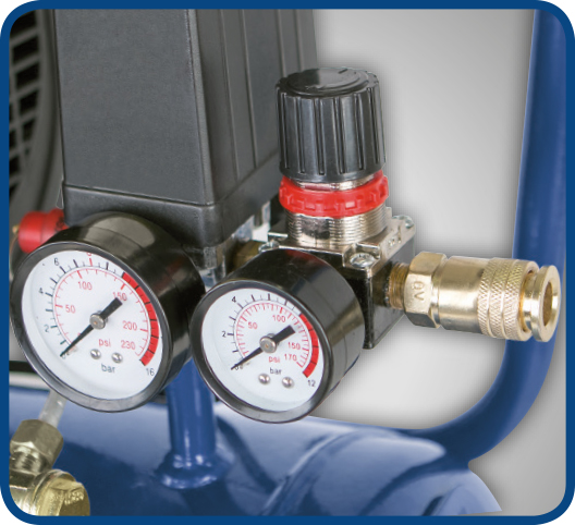 - Jednoduché nastavení a kontrola pracovního tlaku pomocí regulátoru a dvou manometrů (pro tlak ve vzdušníku a pracovní tlak).