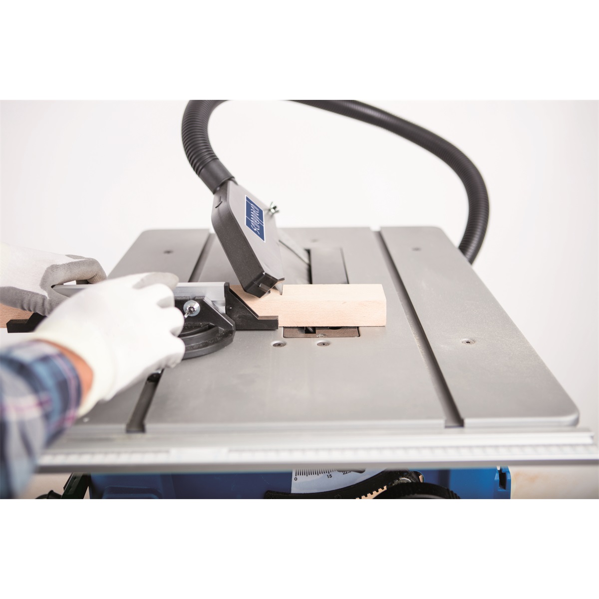 - Pila je vybavena bezpečnostním krytem pilového kotouče, který chrání obsluhu, a rozvíracím klínem, který zabraňuje sevření materiálu a zpětnému vrhu. Součástí je i posuvná tyč pro bezpečné vedení menších kusů materiálu.