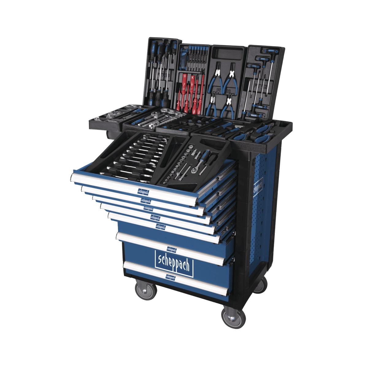 Scheppach TW 1000 je profesionální celokovový dílenský vozík, který představuje komplexní řešení pro uložení a organizaci nářadí v domácích i řemeslných dílnách, garážích či servisech. Vyznačuje se velmi tuhou konstrukcí s opláštěním hran tvrzeným plastem pro zvýšenou odolnost. Pracovní deska z odolného plastu má praktické prolisy pro uložení drobného materiálu a nízký ochranný lem. Snadnou manipulaci s vozíkem zajišťují dvě transportní měkčená madla a čtyři velká pogumovaná kola, z nichž jedno je plně otočné s integrovanou brzdou. Špičkovou kvalitu potvrzují i robustní pojezdy zásuvek, které umožňují snadnou manipulaci i při plném zatížení, mechanismus bránící samovolnému otevření a centrální zámek pro ochranu obsahu. Boční stěny vozíku jsou opatřeny děrovanou deskou pro zavěšení dalšího nářadí. Celkem sedm zásuvek nabízí dostatek prostoru, přičemž čtyři horní zásuvky jsou již plně vybaveny kvalitním a běžně používaným nářadím (gola sady, kleště, různé druhy šroubováků, kladiva, klíče, elektrikářské díly apod.). Zbylé tři hlubší zásuvky si můžete dovybavit dle vlastních potřeb. Každý kus dodávaného nářadí má přesně stanovené místo v pěnových vložkách, což zaručuje dokonalý přehled a rychlou dostupnost.