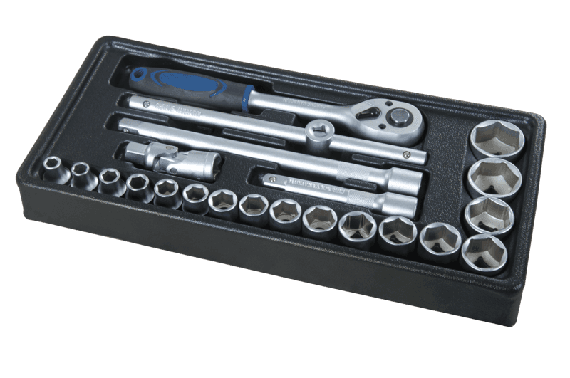 Modul 6 (Gola sada 1/2″): Ráčna 1/2″, Kloubový nástavec 3v1, Prodloužení 5″, Prodloužení 10″, Univerzální nástavec 1/2″, Nástrčné klíče 1/2″ (17 ks: 10-32 mm)