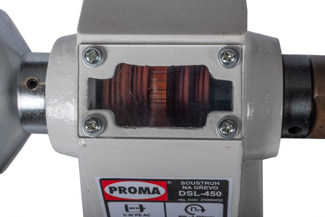 Soustruh na dřevo PROMA DSL-450/1000 je navržen pro běžné soustružení a leštění rotačních válcových, kuželových a tvarových ploch z měkkého i tvrdého dřeva. Jeho srdcem je jednofázový asynchronní motor s instalovaným výkonem 550 W, který pohání vřeteno přes pětistupňovou řemenici, umožňující nastavení otáček v rozsahu 500 až 3200 otáček za minutu (konkrétní stupně: 500, 1000, 1600, 2200, 3200 ot./min). Klíčovou předností je robustní litinová konstrukce a dělitelné lože, které poskytuje možnost volby točné délky 450 mm nebo 1000 mm, čímž se zvyšuje univerzálnost stroje. Stroj je vybaven dvoutlačítkovým ovladačem s funkcí nouzového zastavení pro zajištění bezpečnosti obsluhy a je určen především pro zkušenější uživatele.
