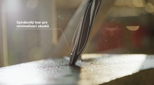 - Samoostřicí zkroucený hrot poskytuje širší stopu ubírání materiálu, což umožňuje plynulejší práci.