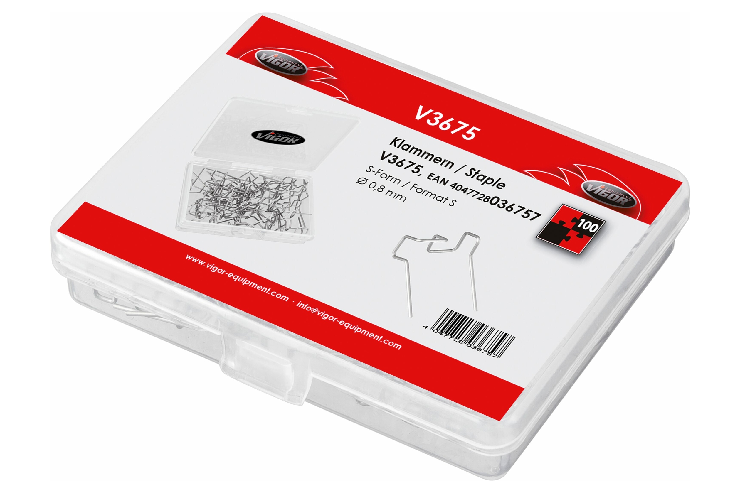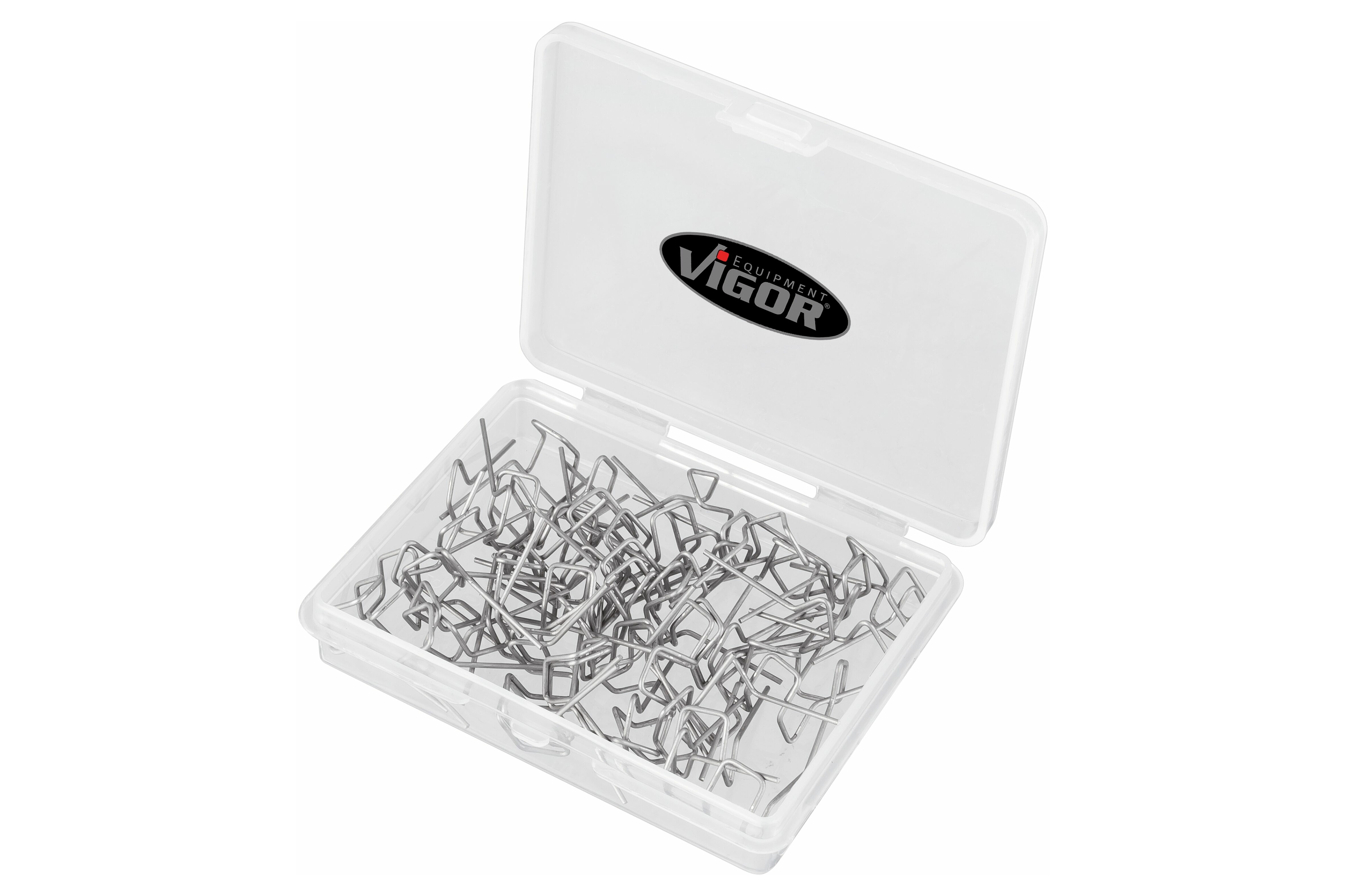 Sada náhradních svorek pro svářečku plastů VIGOR V3675 Typ S, průměr 0. 8 mm. Sponky určeny na opravu – svařování plastových součástí karosérií aut a motorek (např. kapotáže, nárazníků apod. ). Obsah balení 100 ks.