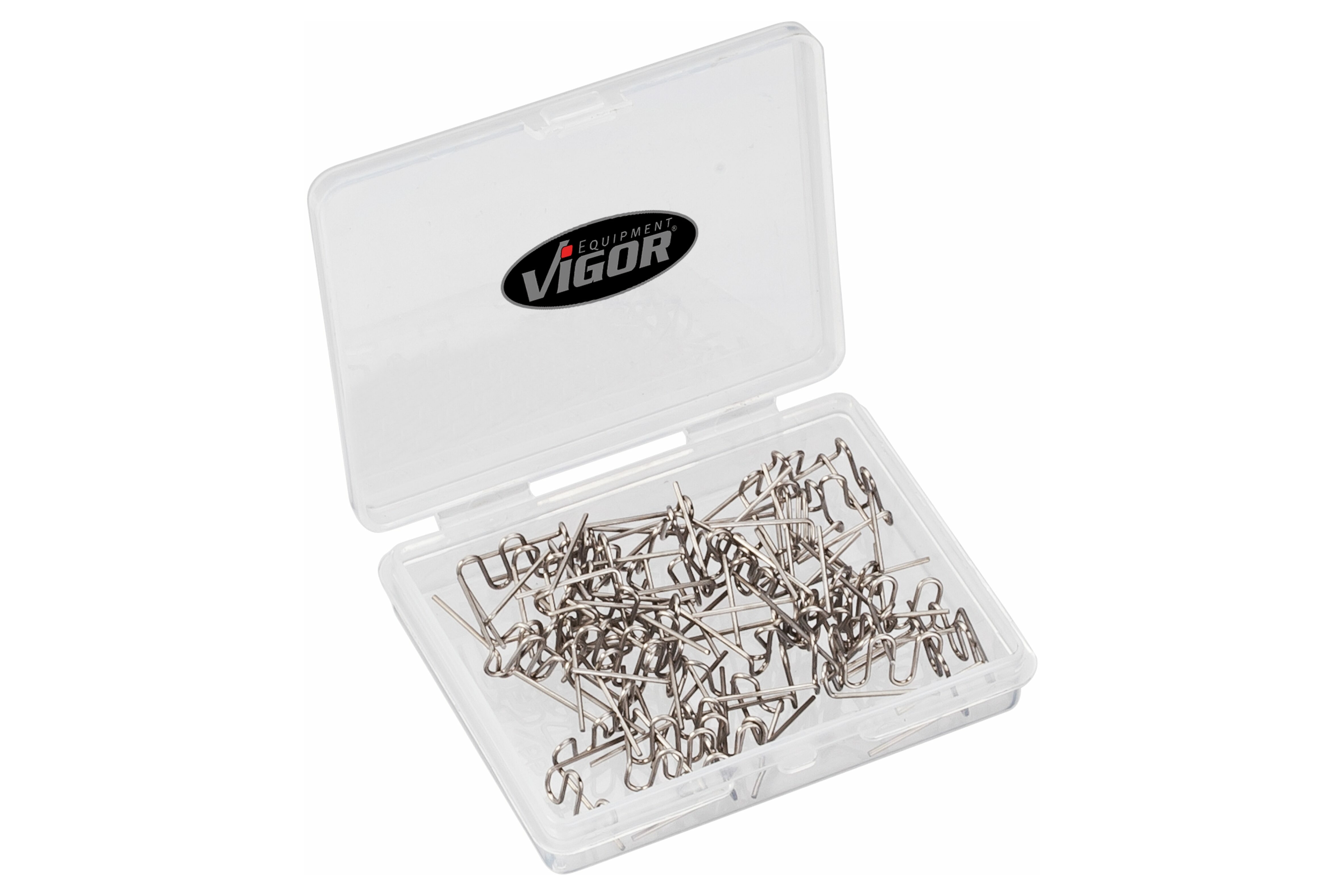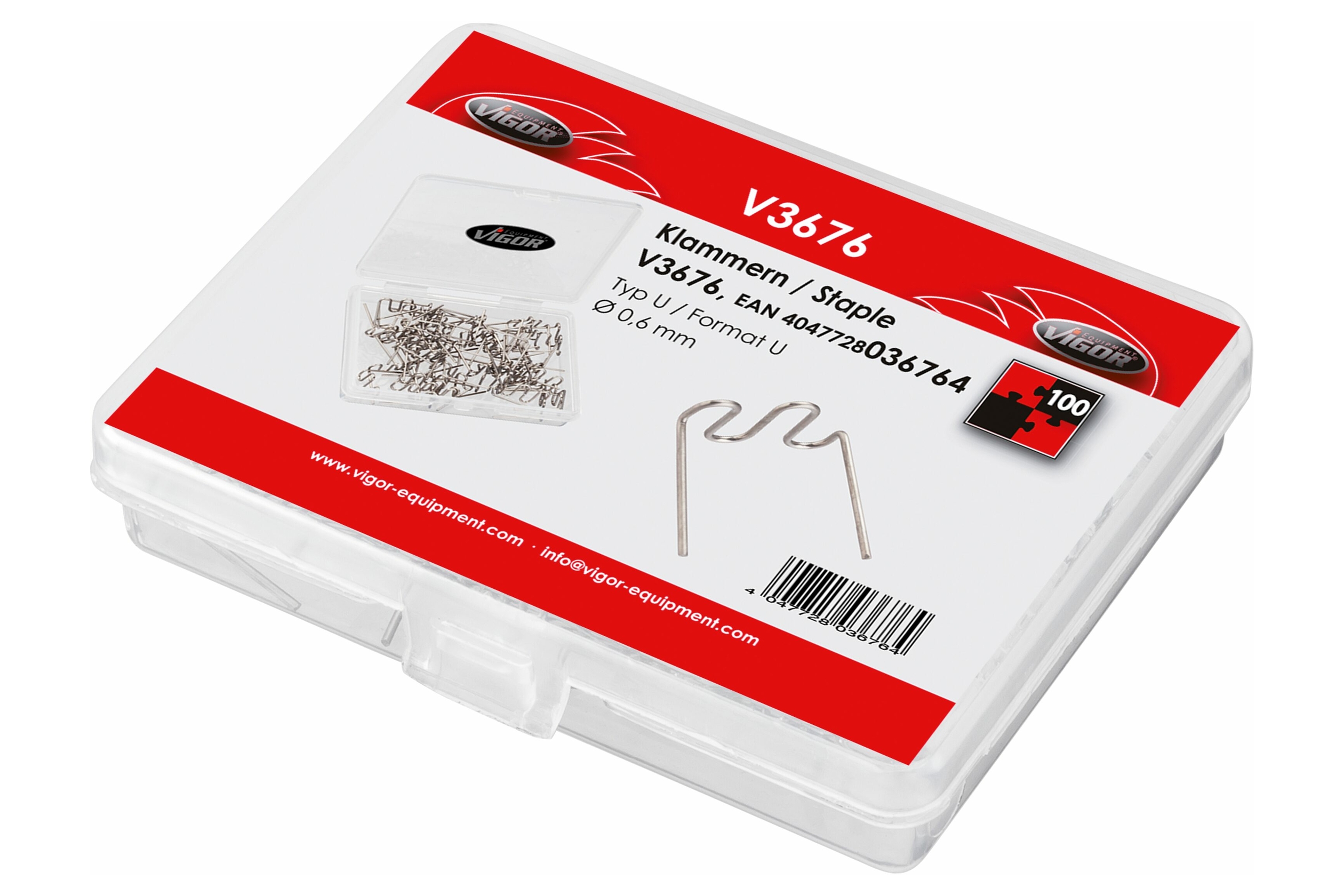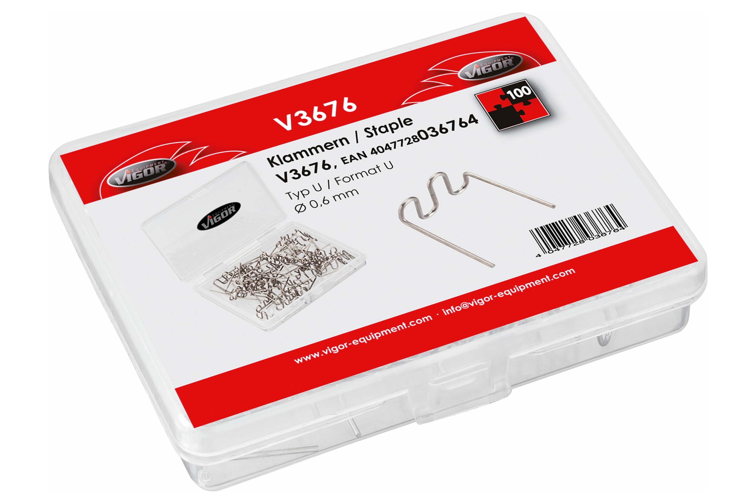Sada náhradních svorek pro svářečku plastů VIGOR V3676 Typ U, průměr 0. 6 mm. Sponky určeny na opravu – svařování plastových součástí karosérií aut a motorek (např. kapotáže, nárazníků apod. ). Obsah balení 100 ks.