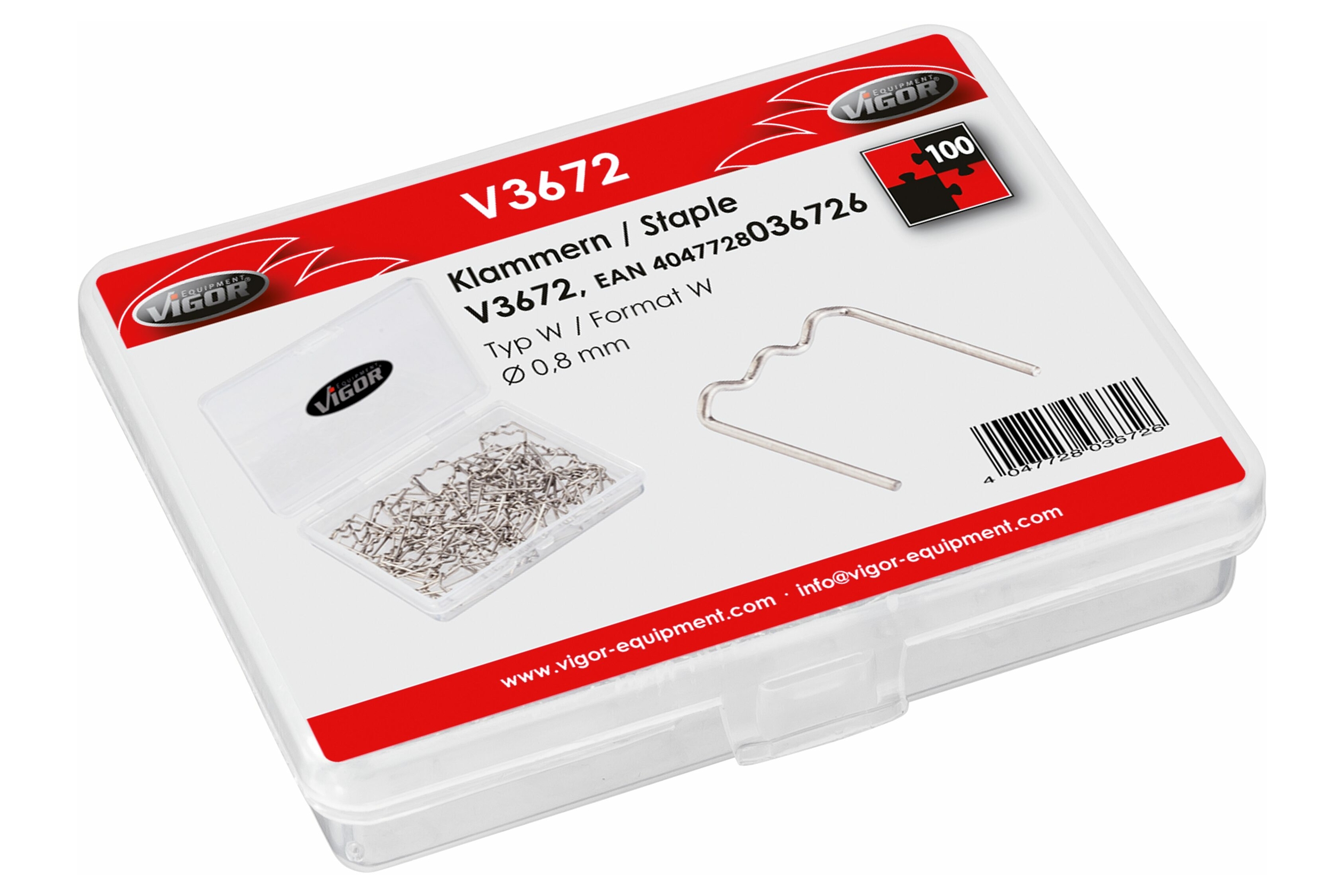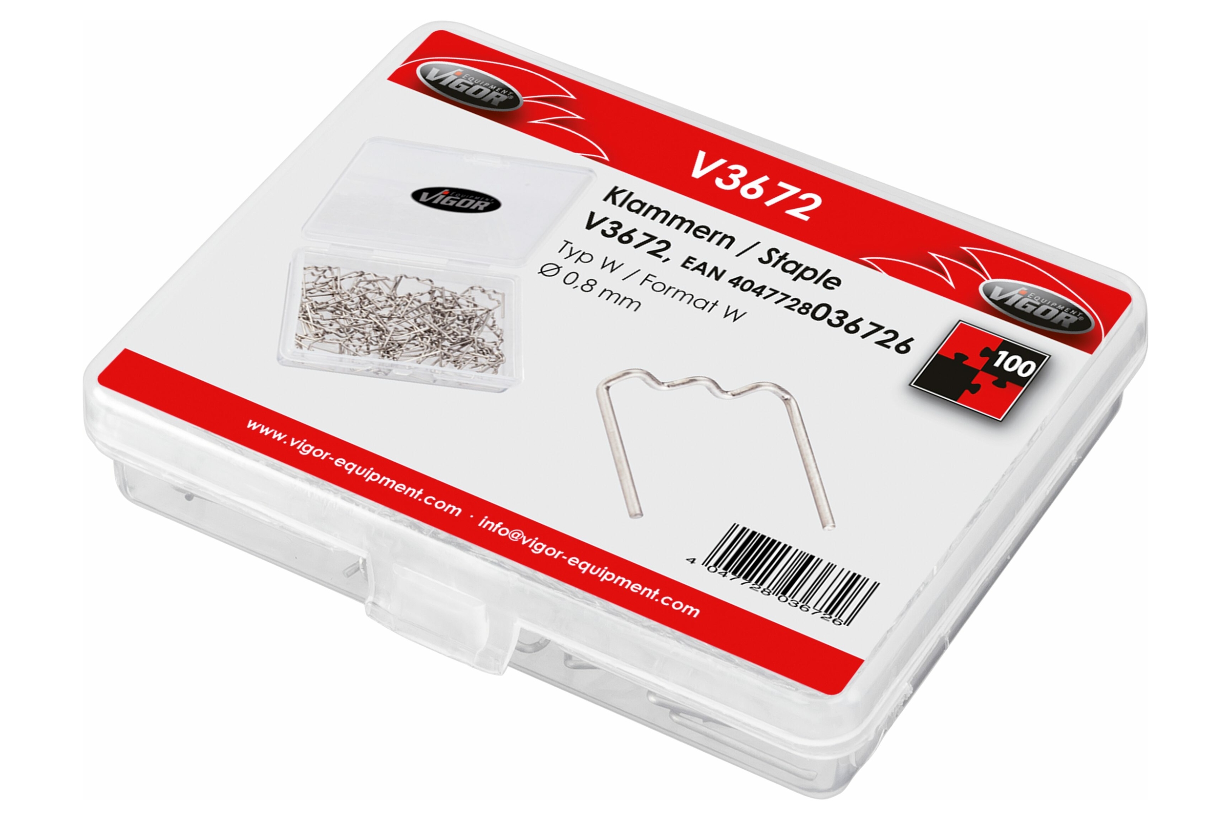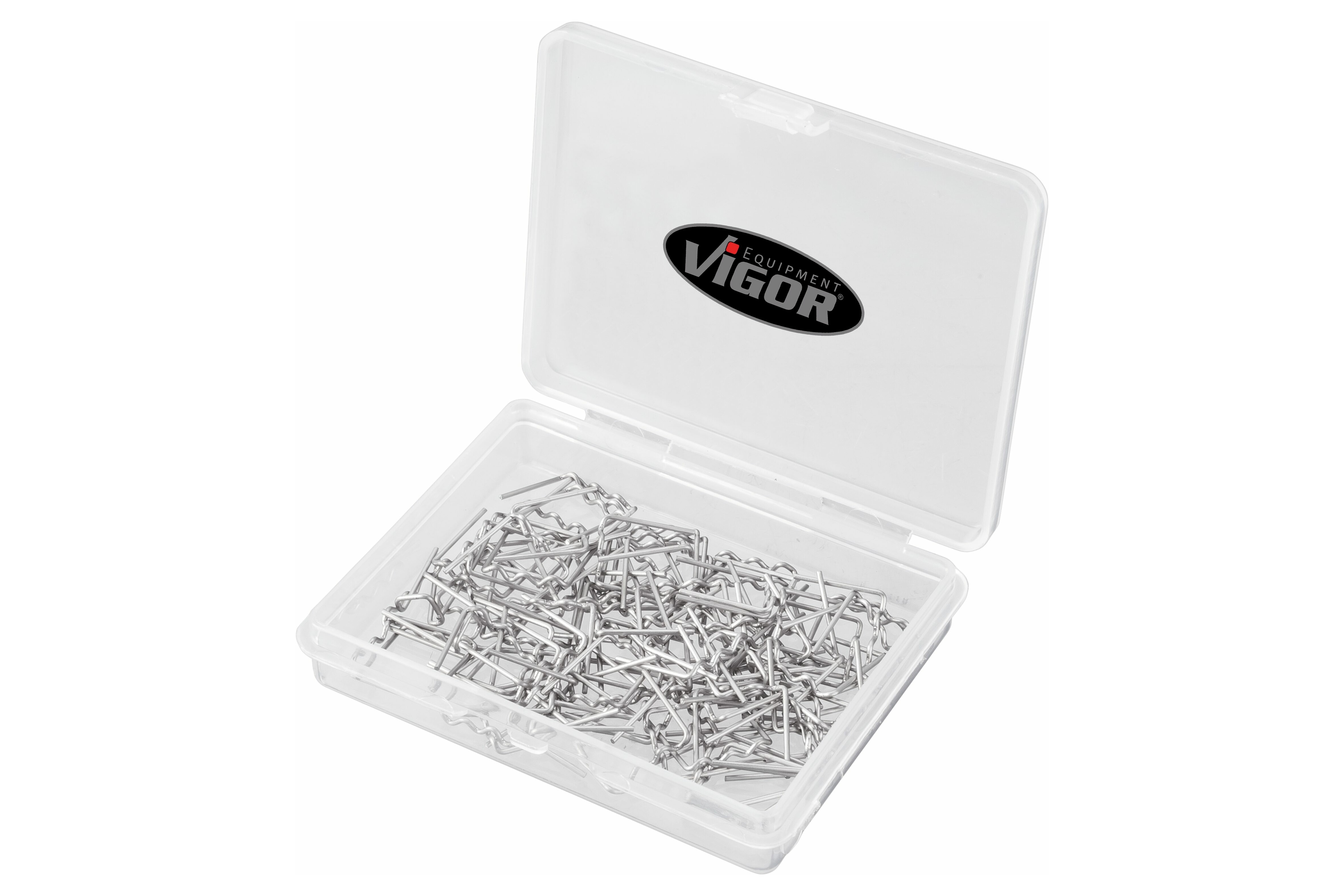 Sada náhradních svorek pro svářečku plastů VIGOR V3672 Typ W, průměr 0. 8 mm. Sponky určeny na opravu – svařování plastových součástí karosérií aut a motorek (např. kapotáže, nárazníků apod. ). Obsah balení 100 ks.