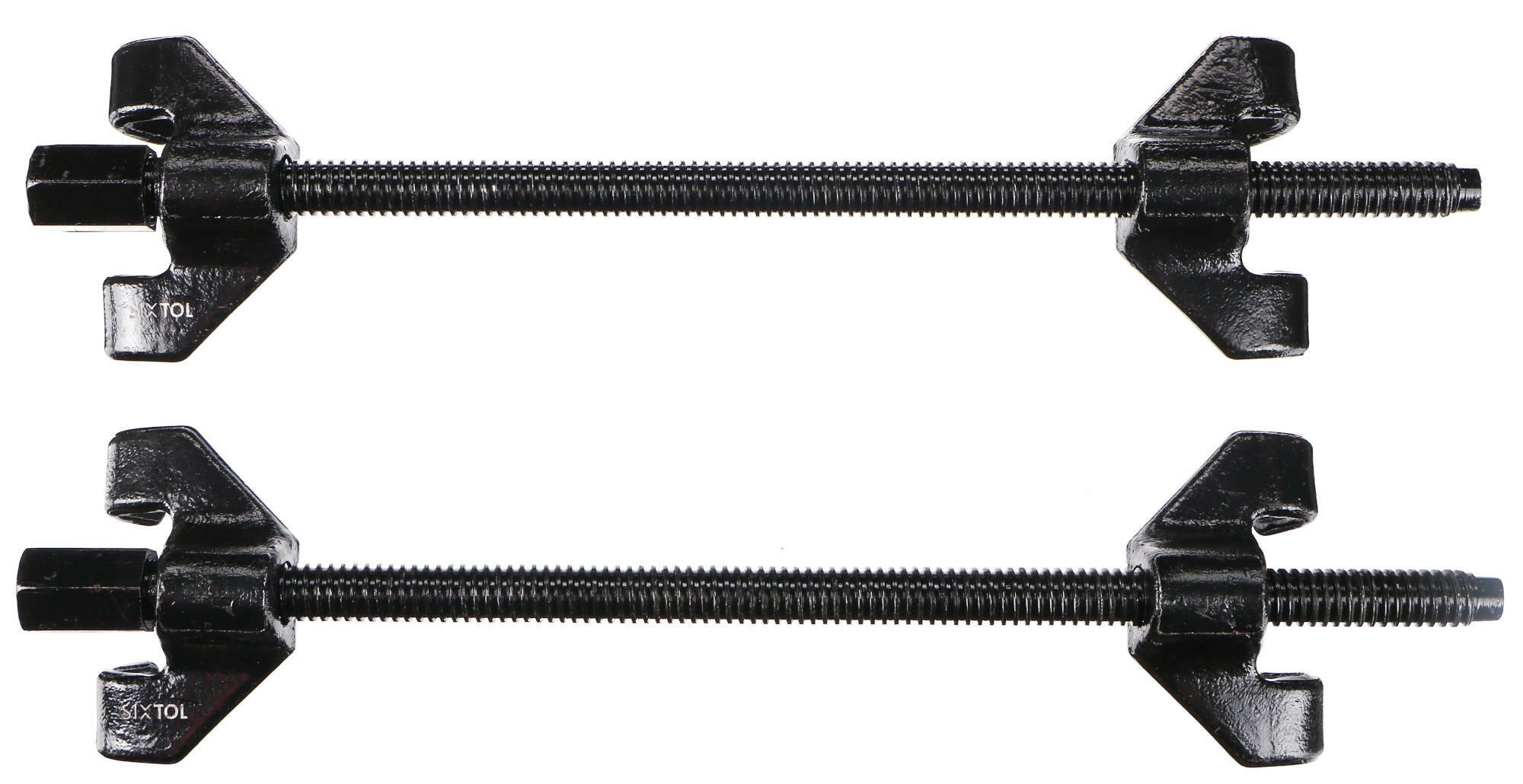 Sada dvou stahováků pružin SIXTOL SPRING SET FORGED o délce 370 mm z robustní oceli. Stahováky jsou vhodné pro všechny běžné typy pružin včetně sloupcových, MacPherson a nezávislých pružin. Na koncích jsou osazeny čtyřhranem pro ráčnu o velikosti 1/2″ a práci s pružinou při zatížení usnadňují jemné závity. Bezpečnost práce je zaručena speciálně tvarovanými dvouramennými úchyty vyrobenými z ocelového odlitku bez svarů.