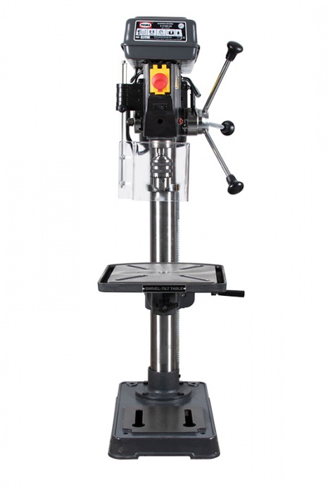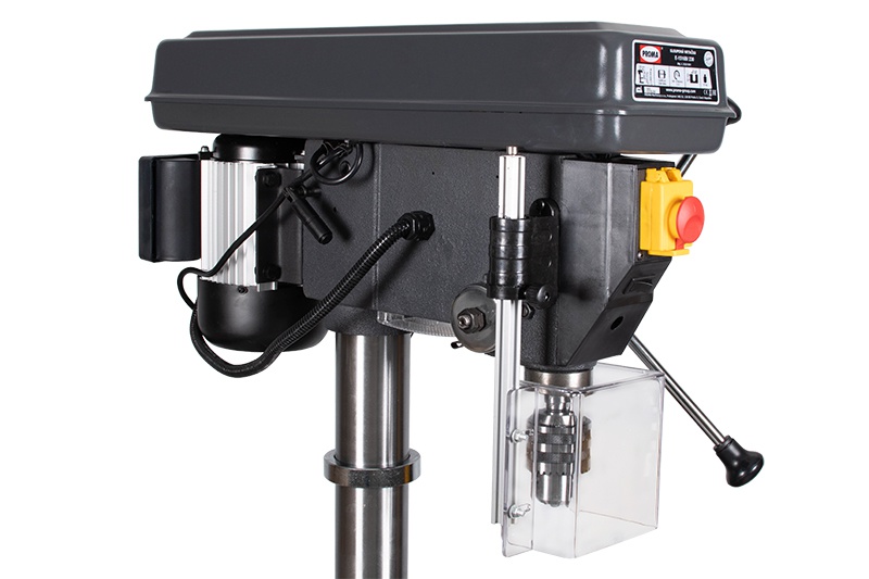 Stojanová vrtačka PROMA E-1516B/230 je univerzální stroj konstruovaný pro vrtání a zahlubování v kovových, dřevěných i plastových materiálech. Vřeteno s kuželem Mk II je uloženo v kuličkových ložiscích, což zajišťuje hladký chod a přesnost. Silný motor o příkonu 750 W s napájením na 230 V poskytuje dostatek výkonu pro vrtání otvorů až do průměru 20 mm. Pracovní stůl je vysoce variabilní – lze jej otáčet o 360° kolem sloupu a naklápět v úhlu +/- 45°. Vrtačka je navíc vybavena praktickým osvětlením pracovní plochy (žárovka není součástí). Díky 12 rychlostním stupňům snadno přizpůsobíte otáčky danému materiálu.