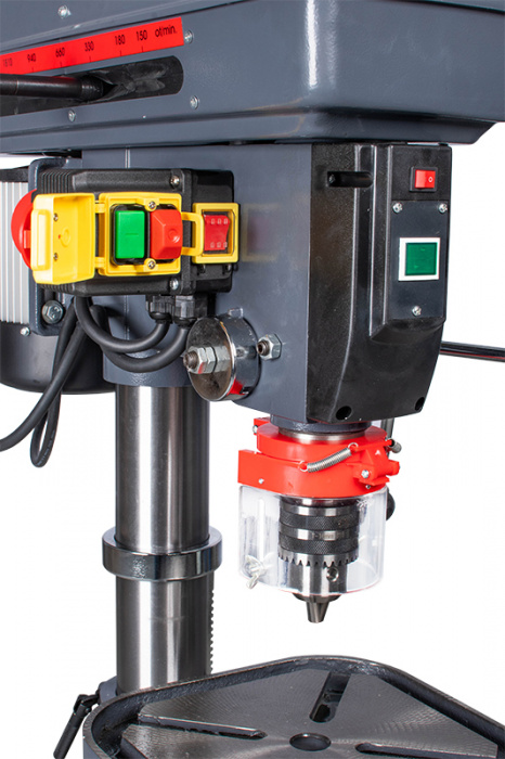 PROMA E-1516BVL/400 je moderní stolní vrtačka navržená pro přesné vrtání, zahlubování a vystružování. Hlavní předností tohoto modelu je použití mechanického variátoru, který umožňuje plynulou změnu otáček v rozsahu 150 až 2150 min⁻¹ bez nutnosti pracného přehazování řemenů. Pro maximální přesnost při práci je vrtačka vybavena laserovým zaměřovacím paprskem, který přesně indikuje střed vrtání. Vřeteno s kuželem Mk II je uloženo v kvalitních kuličkových ložiscích a stroj je poháněn spolehlivým motorem o příkonu 650 W s napájením 400 V. Pracovní stůl je otočný o 360° a naklápěcí o +/- 45°.