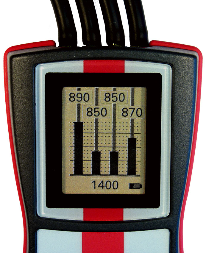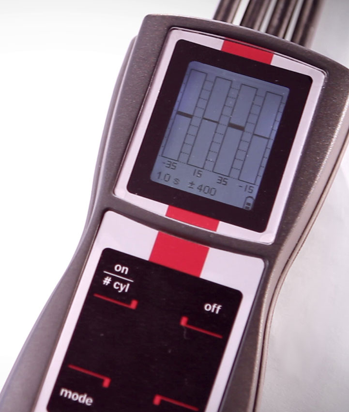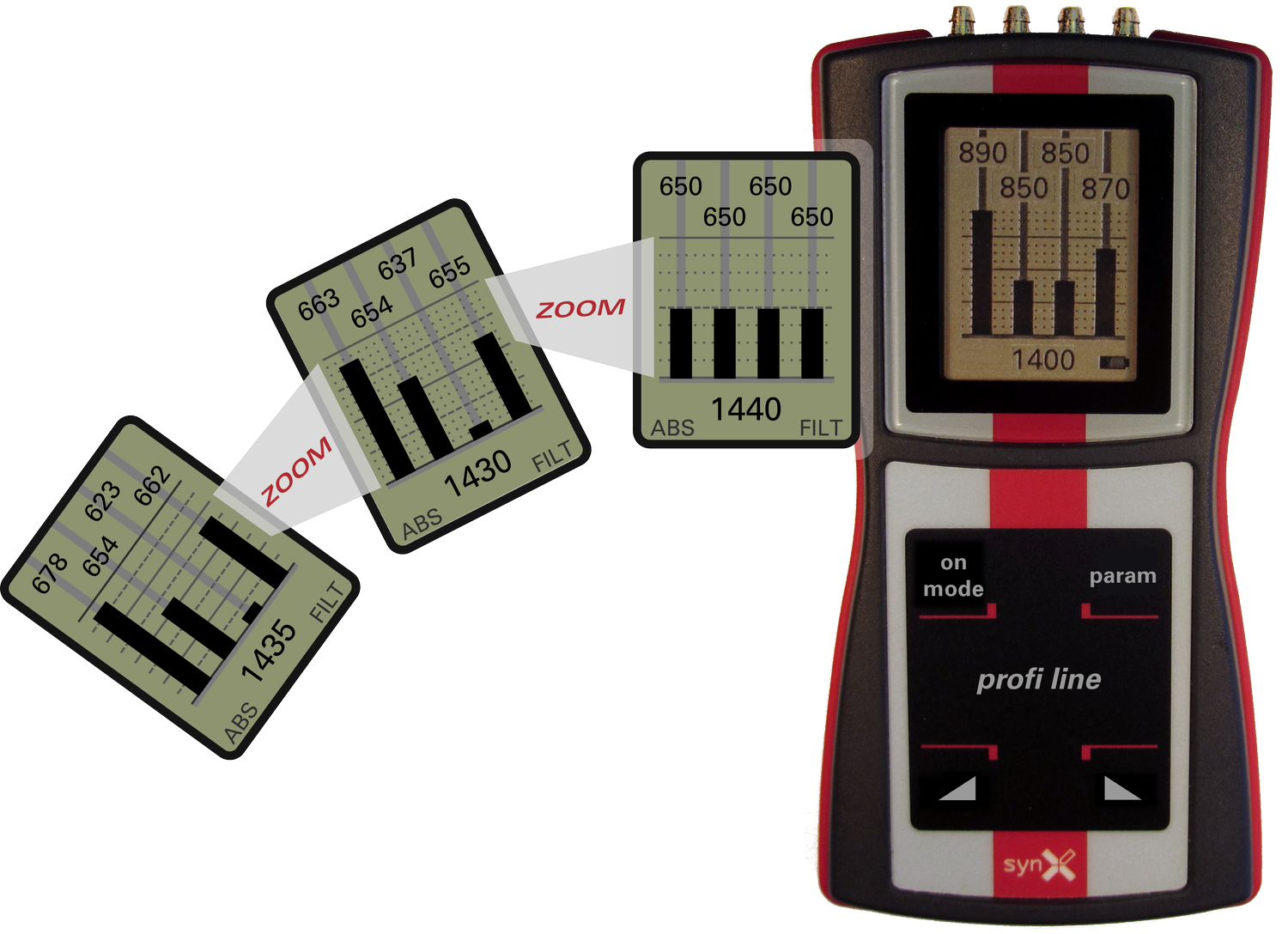 Funkce AutoZoom: Automatické nastavení rozmezí hodnot měření (postupným laděním je měření čím dál jemnější). Tímto způsobem lze čím dál lépe odhalovat i velmi drobné zbývající nepřesnosti v nastavení sání. Senzory jsou vyhřívané.