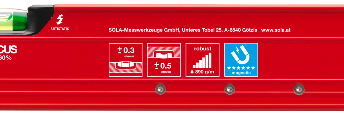 Vodováha digitální 120 cm, Bluetooth, 2 libely, hliník, červeno černá – SOLA RED 120 – 01731401.Digitální sklonoměr je určen pro přesné a pohodlné měření horizontálního a vertikálního úhlu v dílně, garáži, zahradě nebo na stavbě. Technologie Bluetooth umožňuje přehledný soupis výsledků přes aplikaci SOLA Measures.Vodováha umožňuje zobrazení sklonu v jednotkách °, %, mm/m a in/ft. Funkce „Hold“ slouží pro ukládání naměřených hodnot a pro přenos úhlů.Odečítání hodnot je možné díky reverznímu zobrazení při měření otočeném o 180°.Technické parametry:• Délka: 120 cm• Počet libel: 2• Materiál: Hliník• Stupeň krytí: IP65• Barva: červeno černá• Tolerance měření: 0.50 mm/m (0.029°)